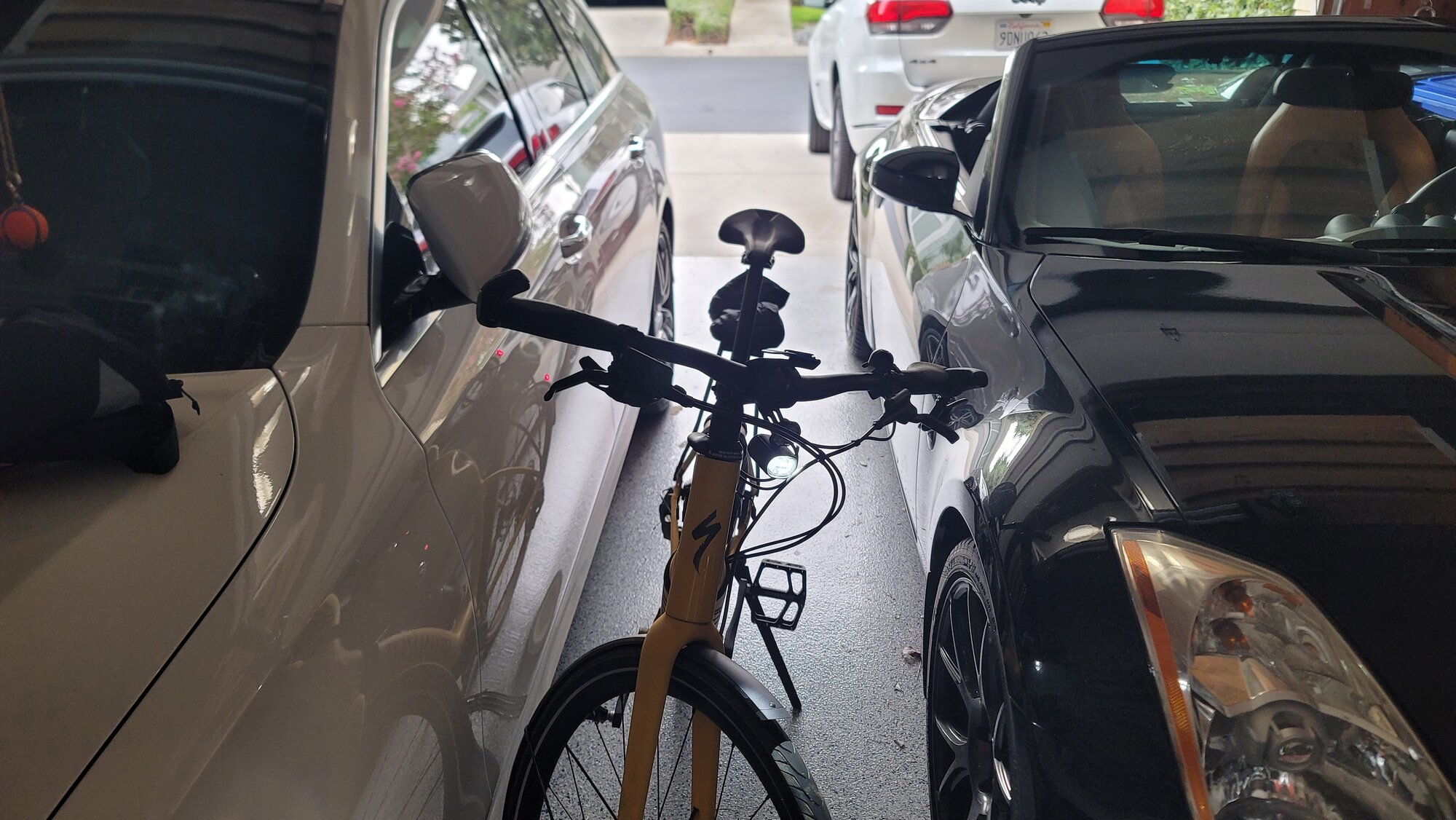 Back home, all bikes have to negotiate this tight squeeze between cars. Threading the heavy hub-drive past the mirrors is always slow going. Much faster to lift the SL over them.