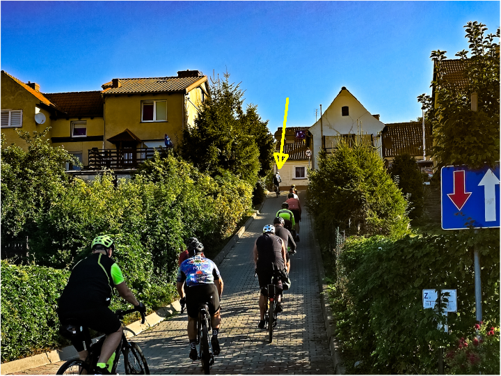 There was a very steep climb in the race beginning. To make it better understandable: I had to use SL Turbo mode and the 32-51T gearing to climb there myself! The arrow points at Jacek. (I also have a photo showing weaker riders dismounting and walking their bikes uphill!)
