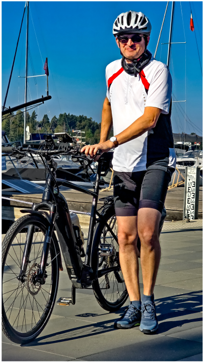 My first e-bike competitor met on that morning: Wojtek. As you can see, my facial expression means fear(Why does Wojtek ride an e-bike? Lower back ache. He is otherwise a healthy and strong rider).