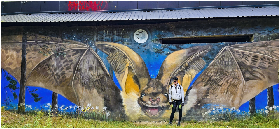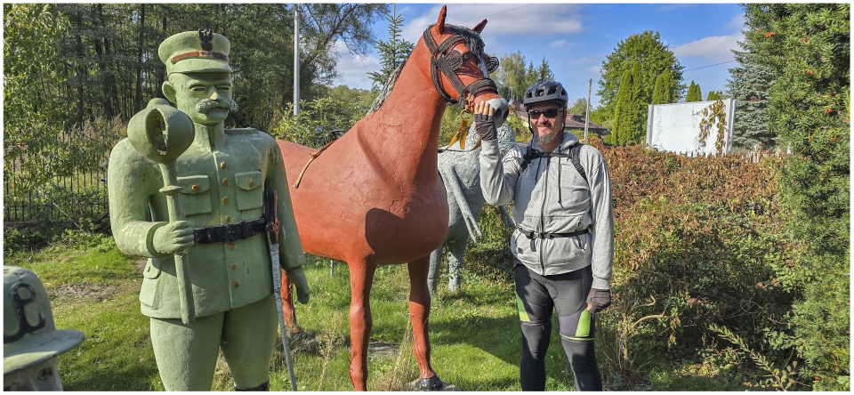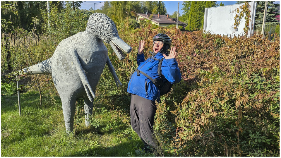 We were riding a rail trail. Here, naïve art by a grocery store. The sculptures have been created by some elderly man who felt being an artist