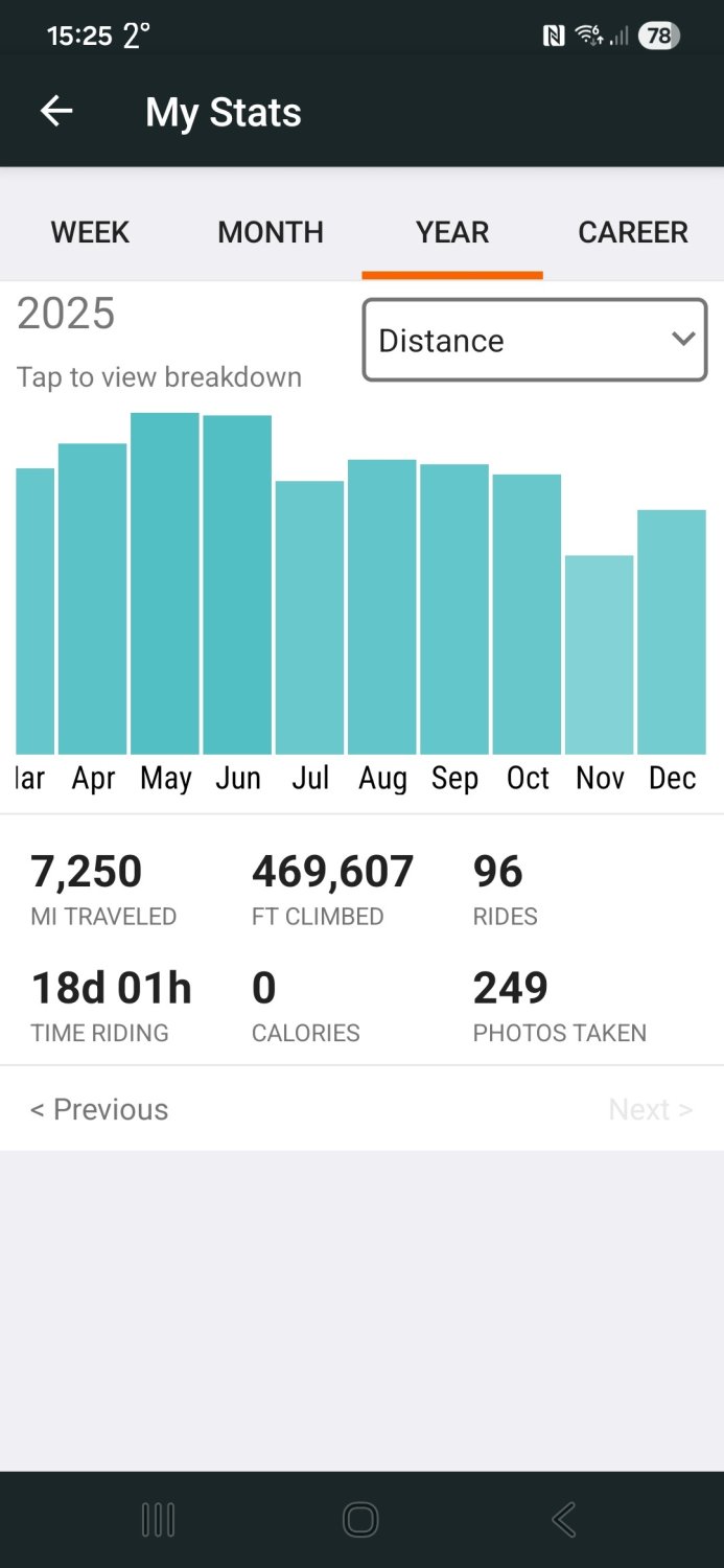 On to the records, my best yearly total of 7250 miles and my best ever elevation gain of 469,607 ft! I also beat last years total of 22 imperial centuries by 1 so a very productive year on the bike! A screenshot of my stats for the year! Only 96 rides but my best ever average yearly mileage of just over 75.5 miles!
