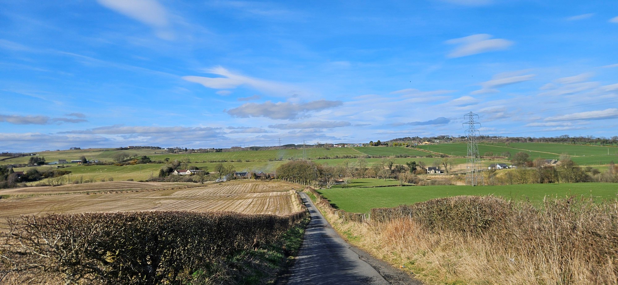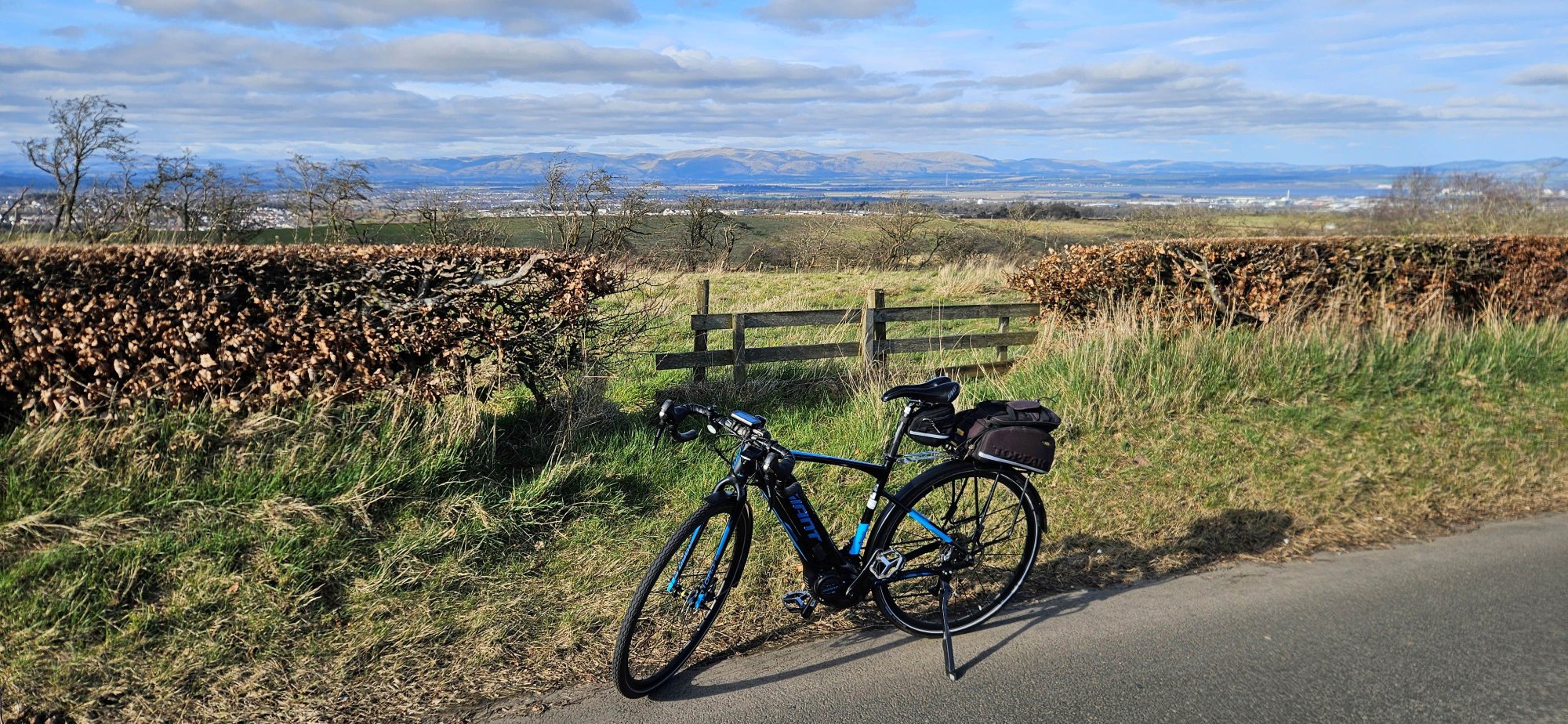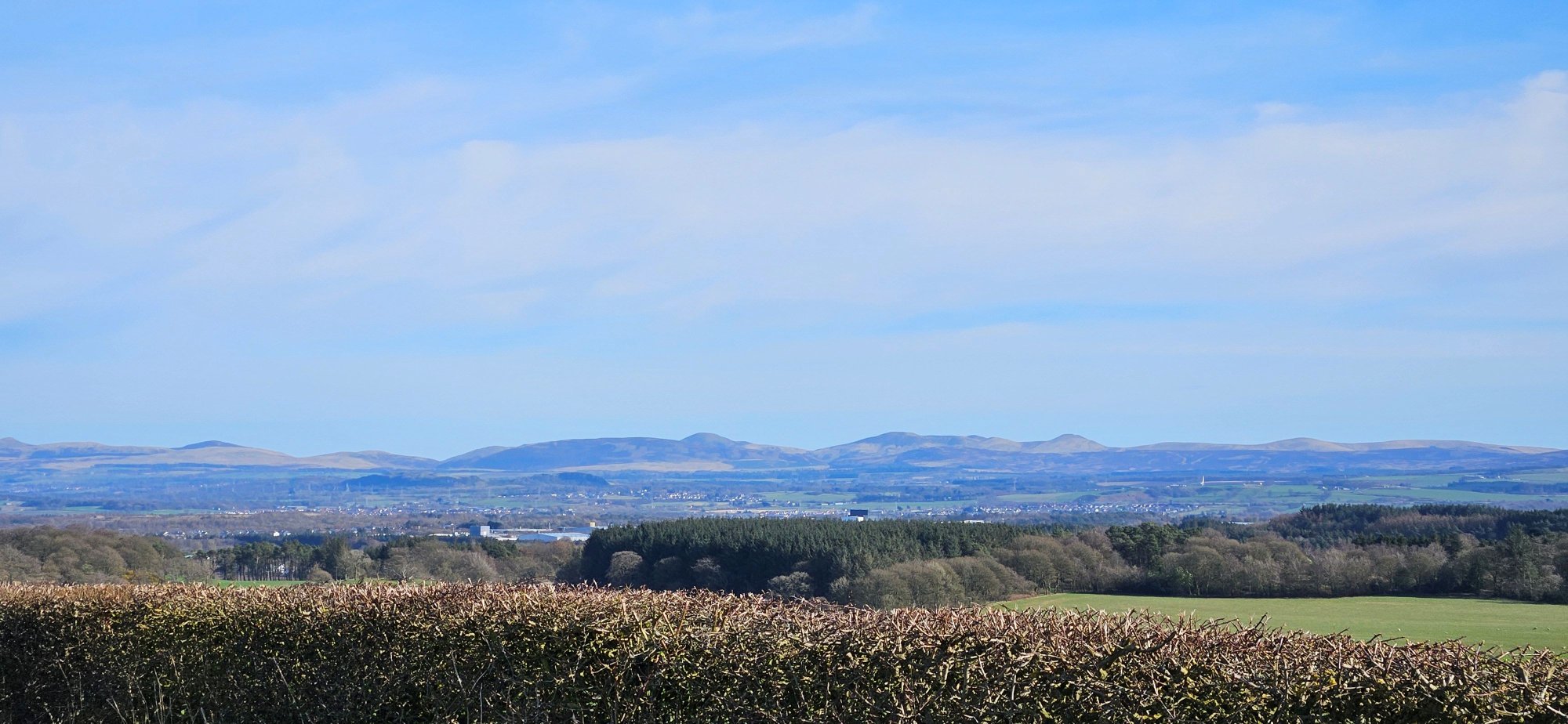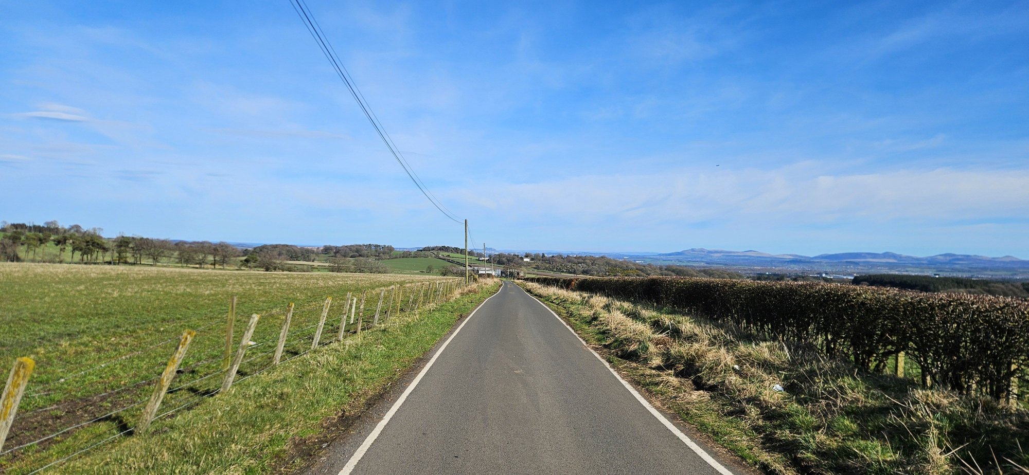 Then I had a nice descent immediately followed by a climb up into Shieldhill, where I turned west to take the back road to Slamannan where I got one last photo of the Ochils!