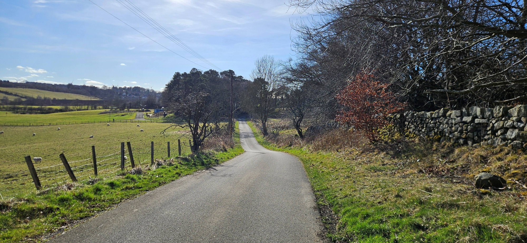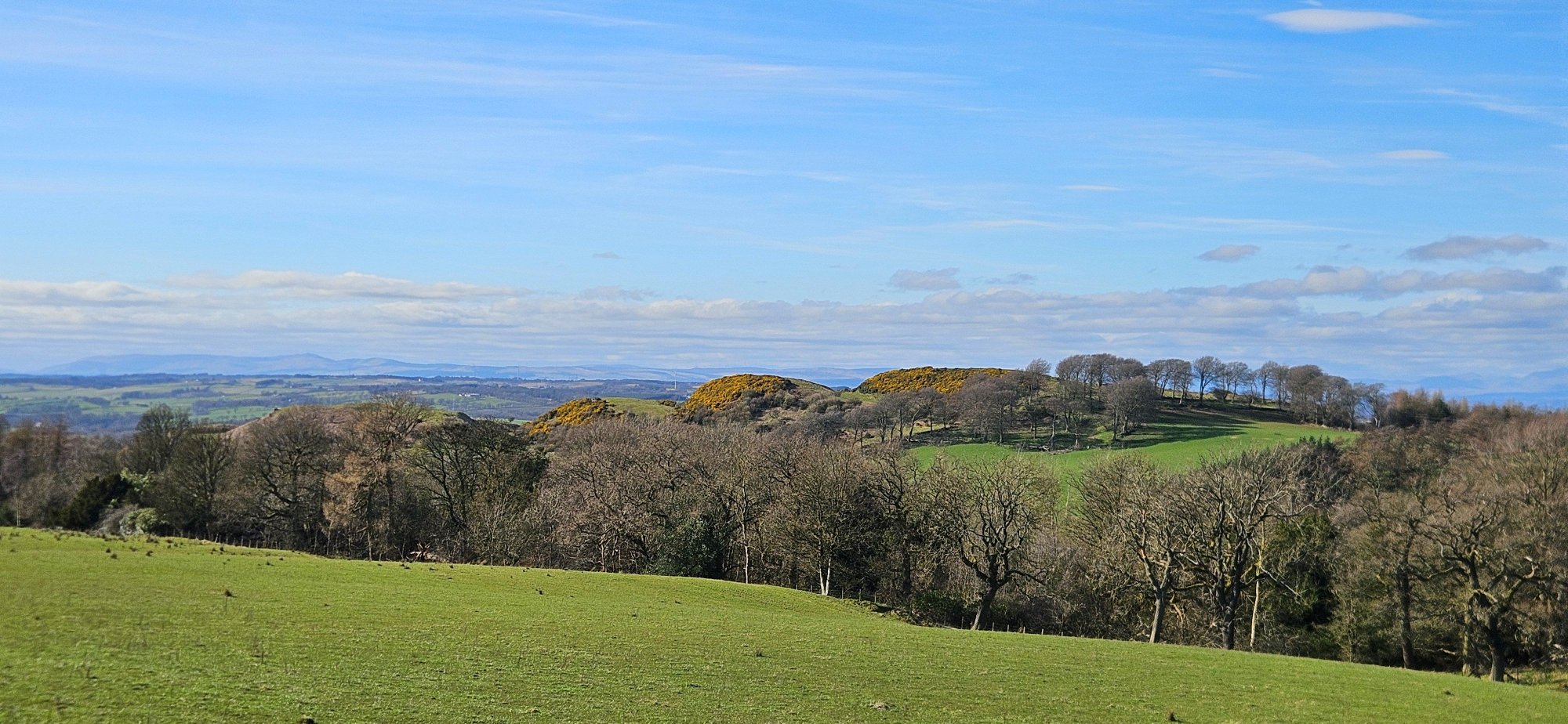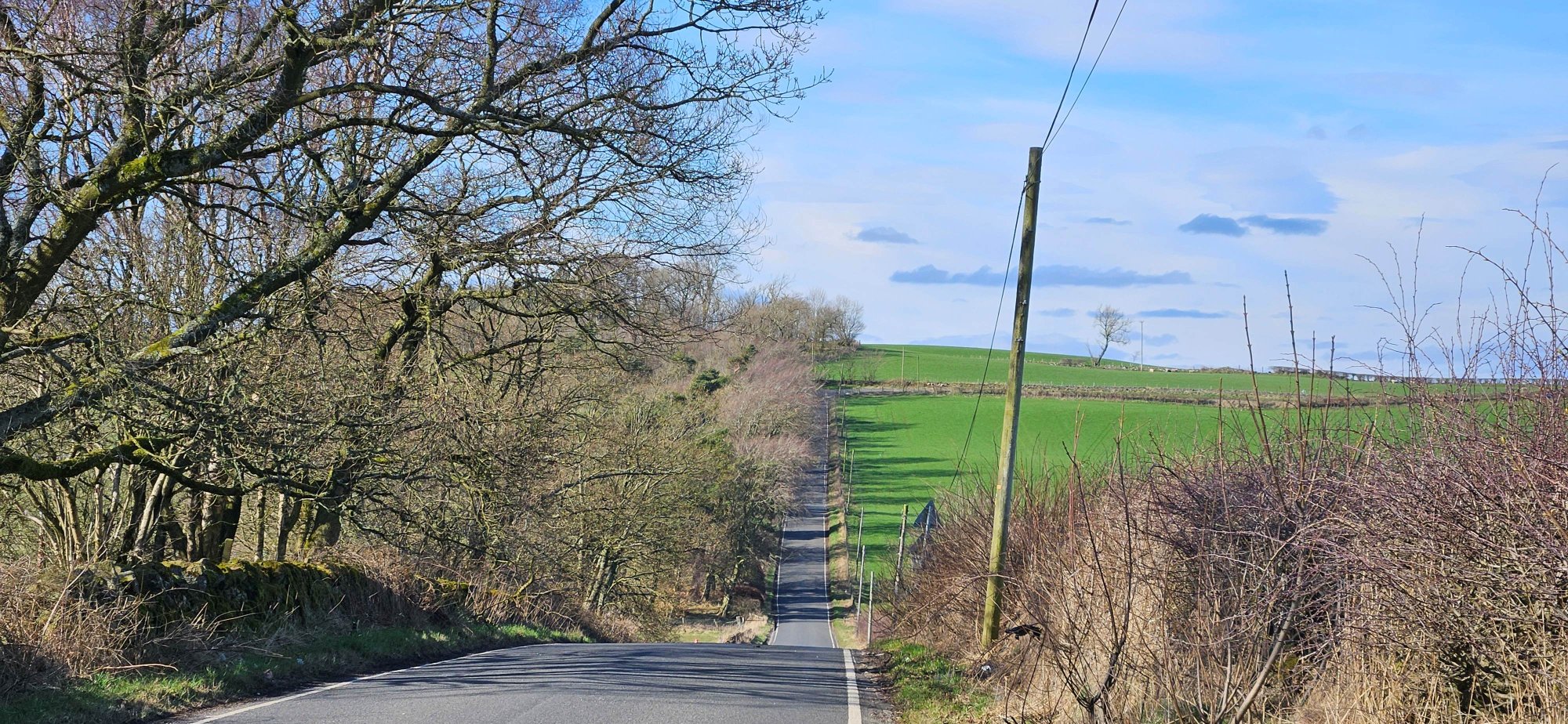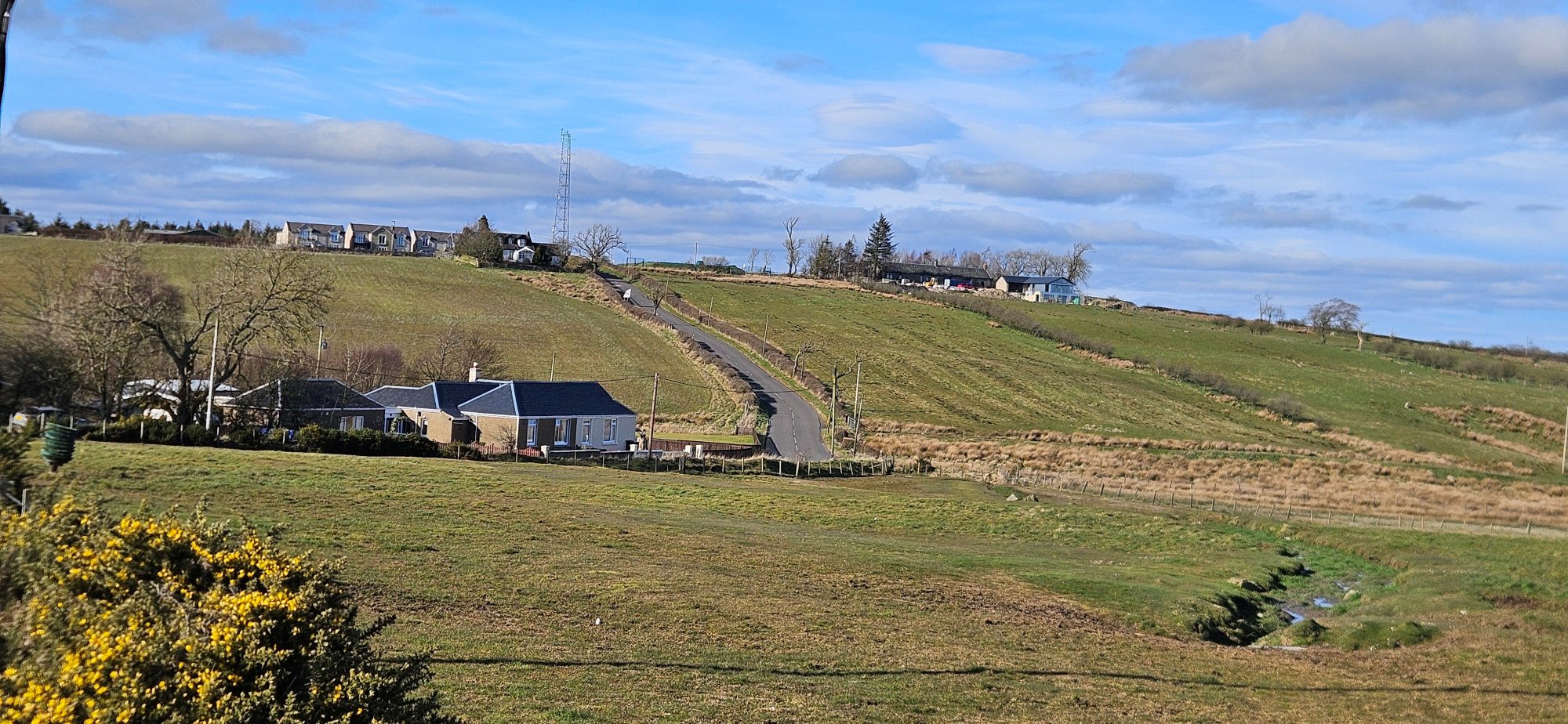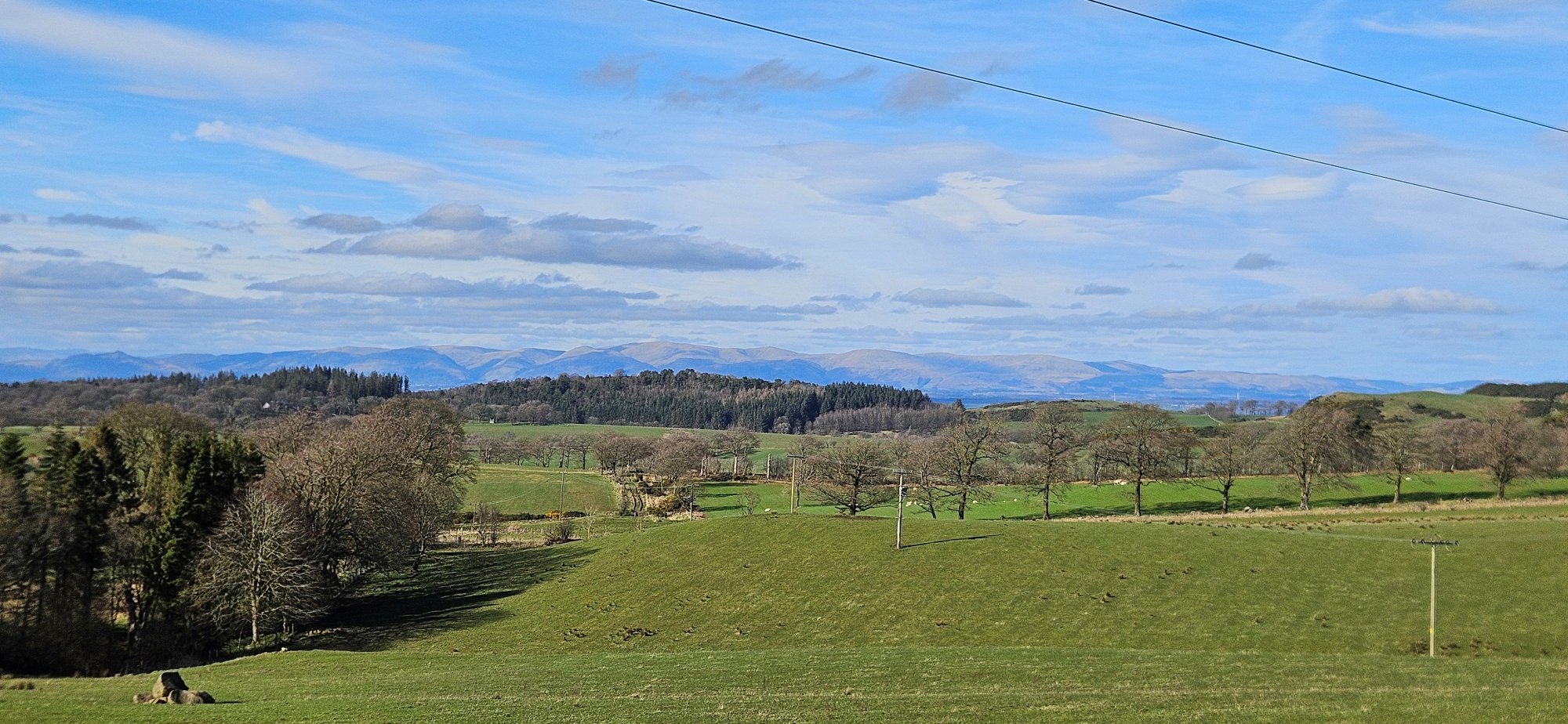 Then I had a nice descent immediately followed by a climb up into Shieldhill, where I turned west to take the back road to Slamannan where I got one last photo of the Ochils!