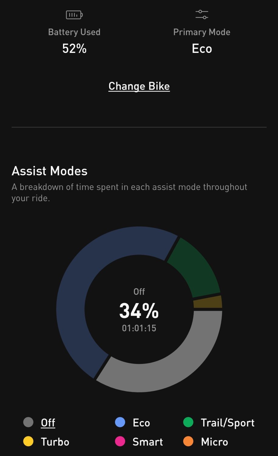 So, Plan A was to ride in OFF as much as I possibly could, pamper my sore knees with SPORT on starts and hard accelerations only, and fall back on ECO as needed. In the end, rode 34% OFF and 49% ECO.