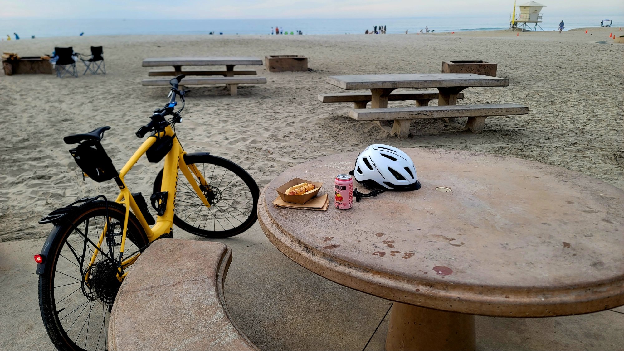 The group ride ended as always at a coffee shop, this time in Solana Beach. I was too bushed to eat or drink then, but by the time I got to Moonlight Beach, the chipotle aoli dogs at the concession stand there were calling to me. Compared to the high-sugar pastries I would normally have had at the coffee shop, I told myself, a dog was downright healthy.