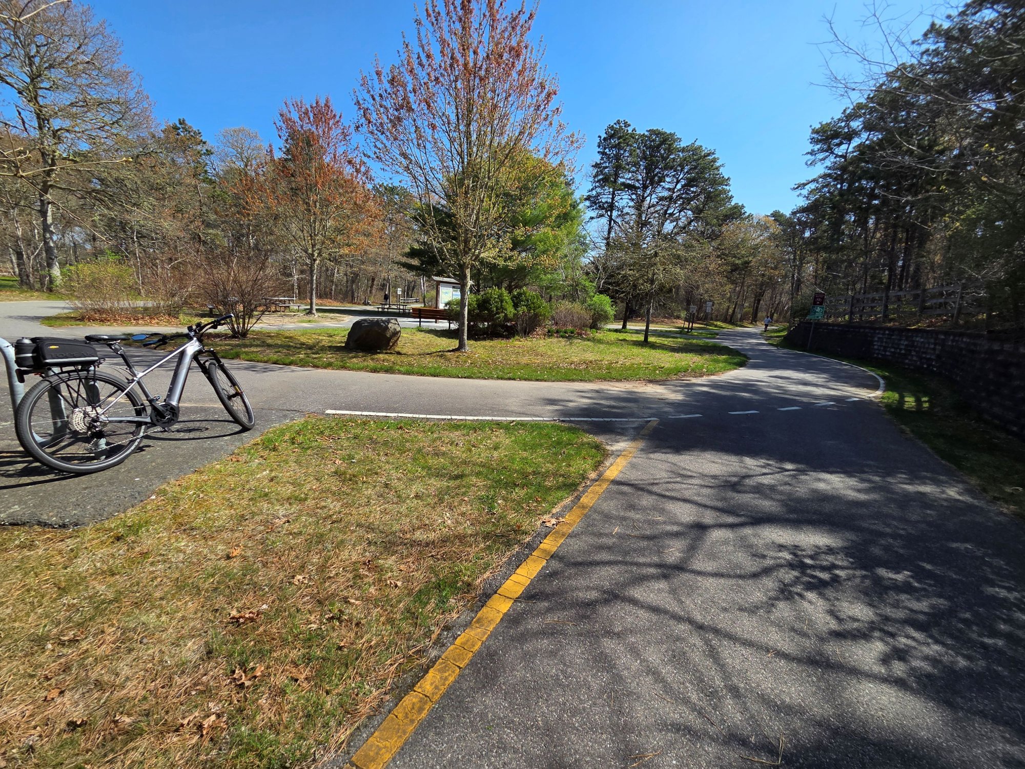 This is something I've never seen before riding here, a bike rotary or roundabout. The right path goes to downtown Chatham. The left path goes to the outer Cape. In Brewster, MA.