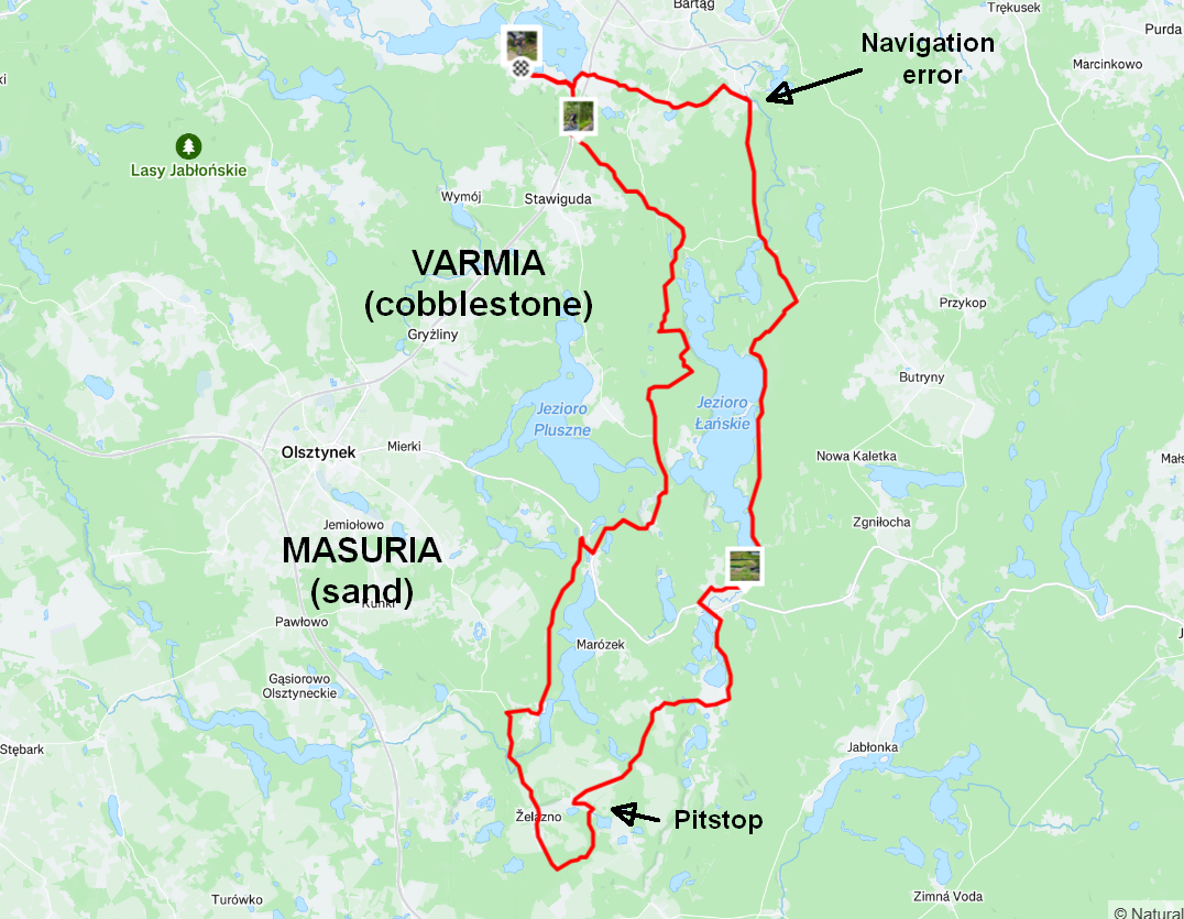 The race base was located in Majdy near Olsztyn/Allenstein (the province capital city) on a big Lake Wulpink. At 9:00, the girls started the Classic gravel race (100 miles).