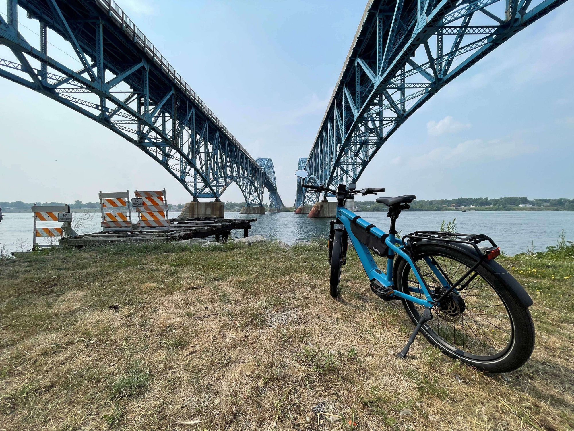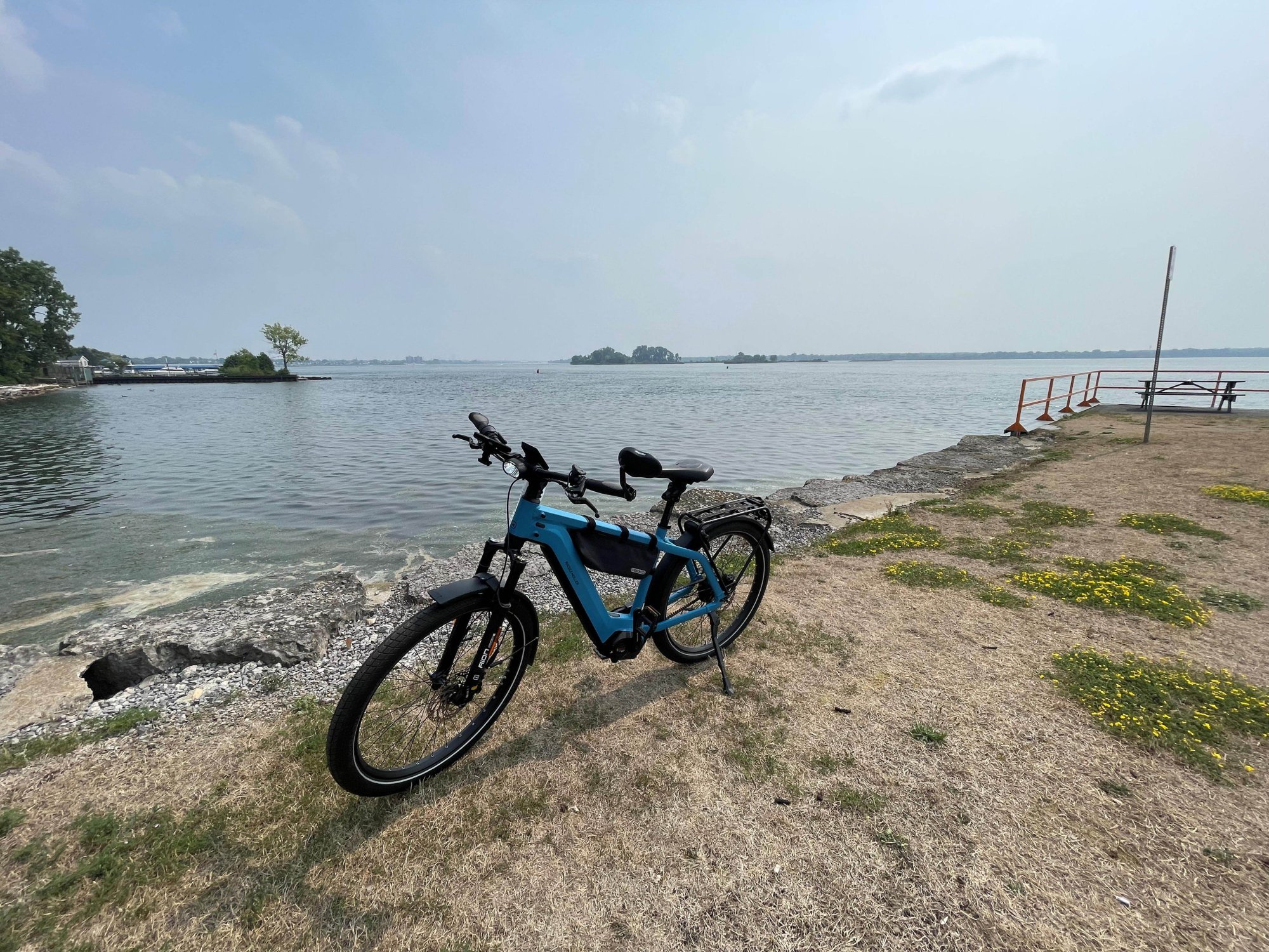 This is the widest part of the Niagara River between Buffalo NY and Fort Erie Canada before it splits and goes around Grand Island and eventually Niagara Falls. Strawberry Island can be seen with Canadian shore beyond. City Buffalo and Peace bridge to Canada is behind my bike hidden by haze from Canadian wild fires.