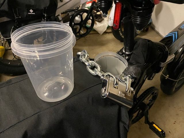 I also found a plastic container at Dollar Tree @2 for $1, and wrapped it in black duct tape for added strength and color. It was flexible enough to conform to the space between the seat post and the rear rack, and I put the lock in it after wrapping the sheathed chain around the frame handle.