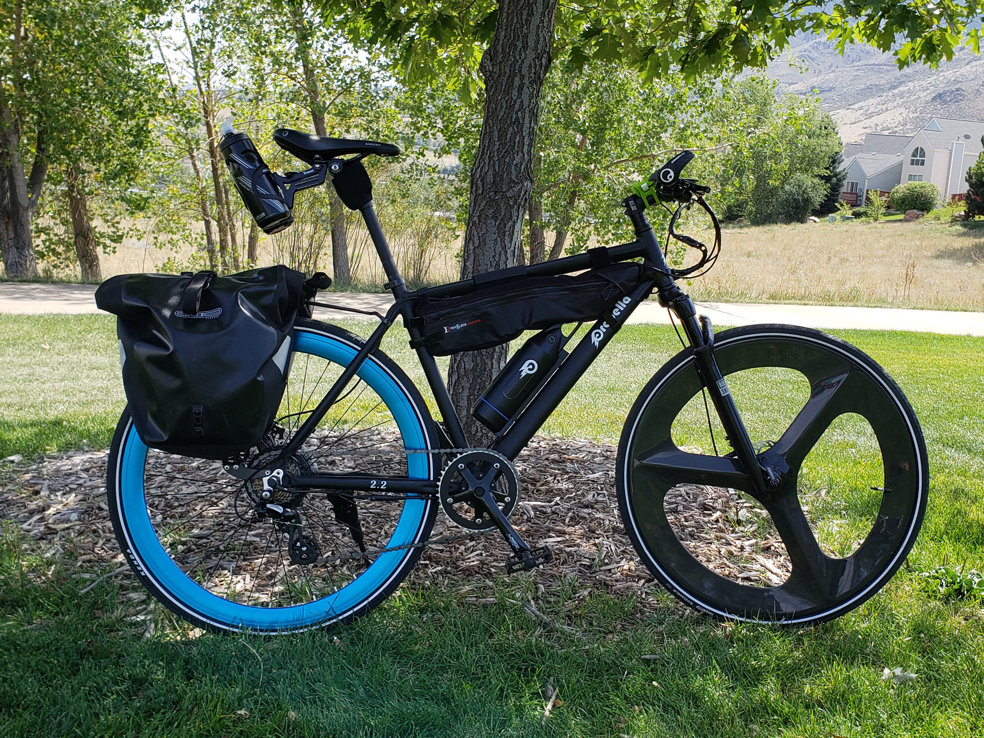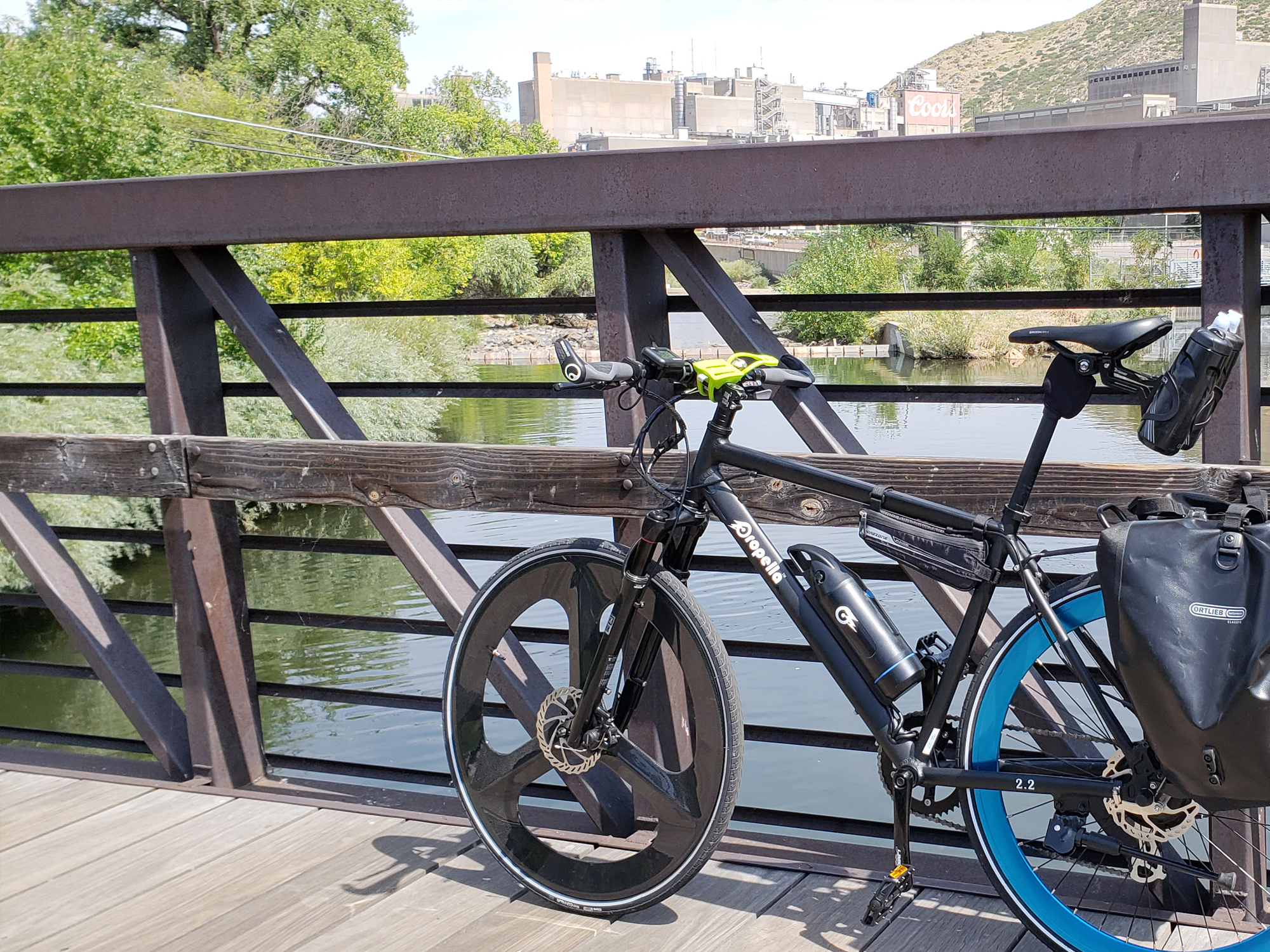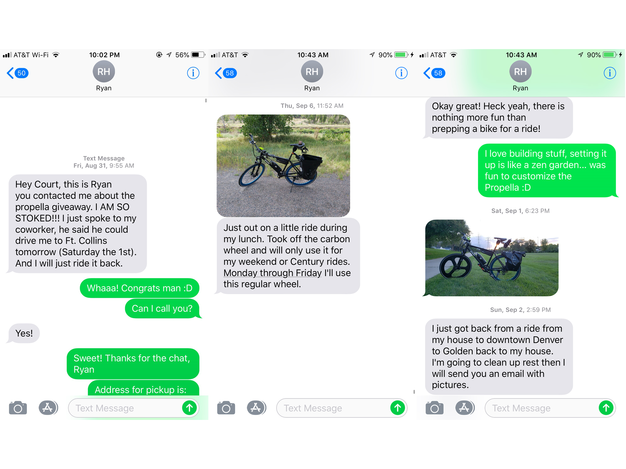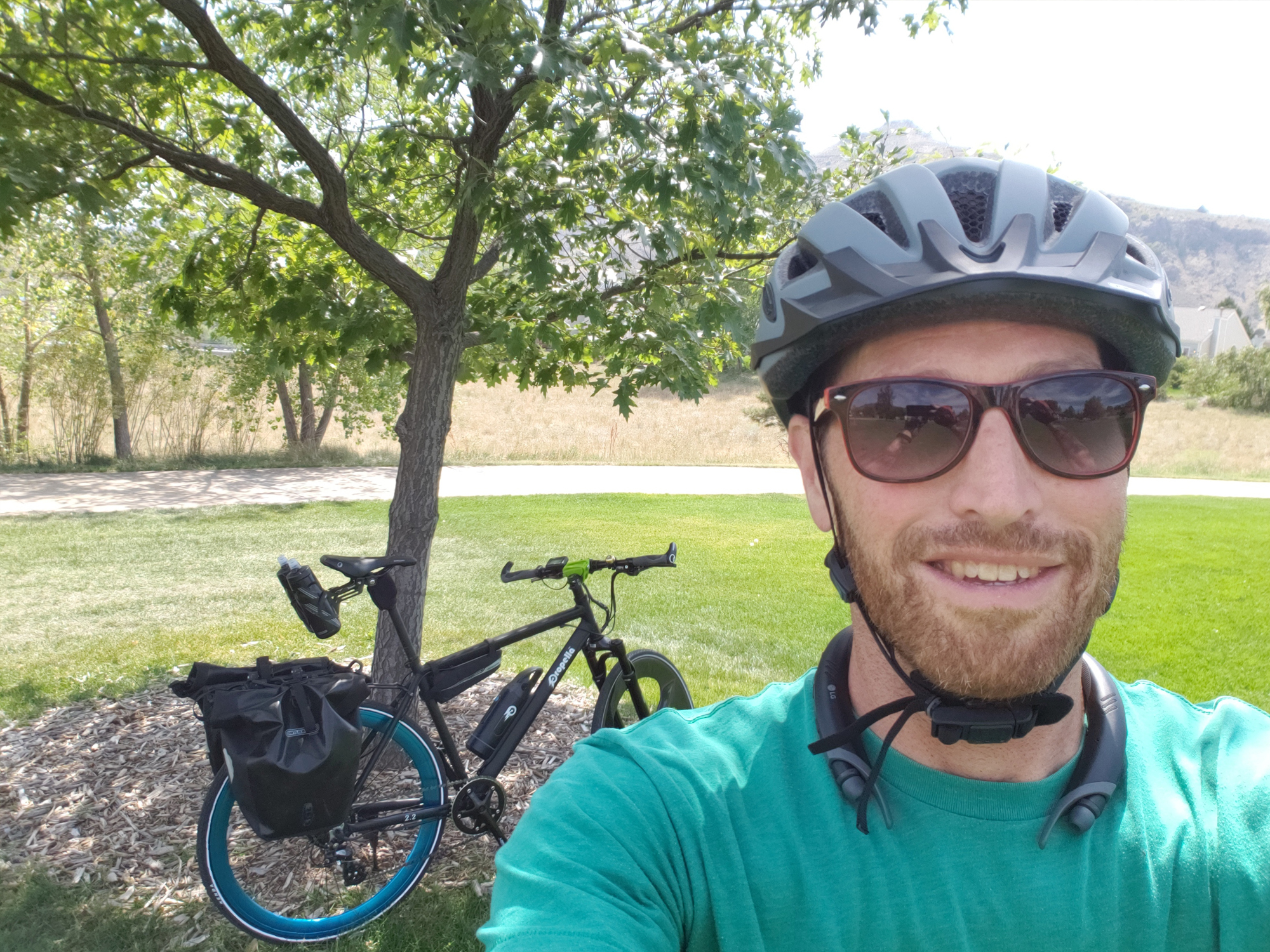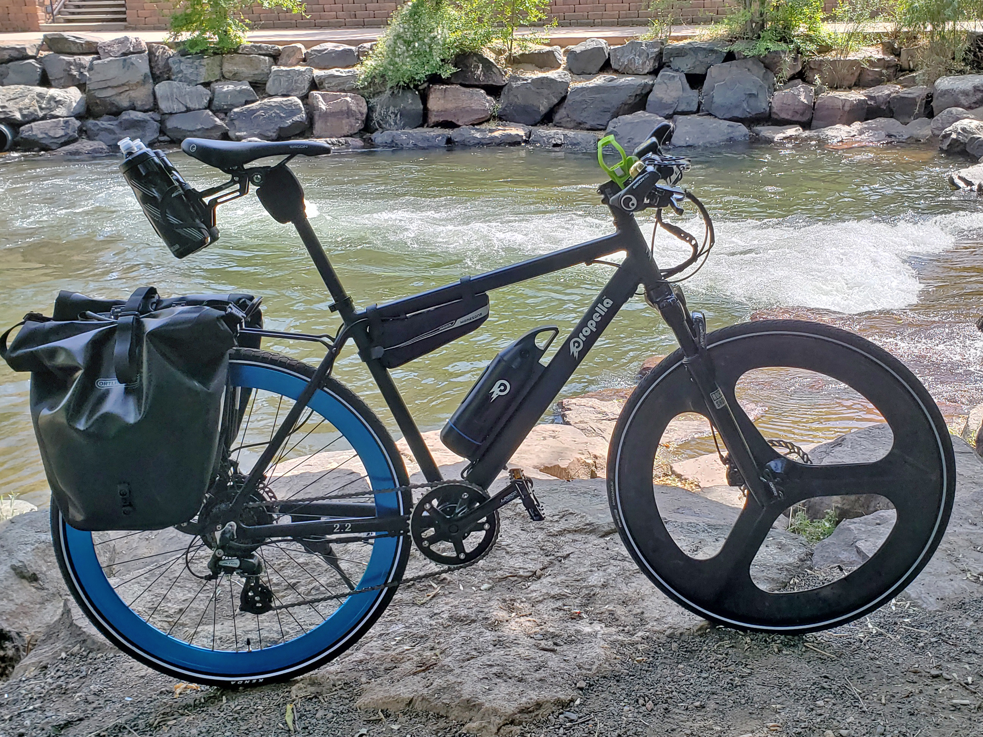 Once he got the bike home and had an opportunity to ride around some, Ryan sent me this email update along with some pictures: Good day Court, I went on a 36 mile ride today with the Propella. I started off by heading down to REI downtown Denver from my house and then over to Golden and then back to my house. I used the battery during some constant inclines and some large hills. I got to a top speed off 34mph a few times while going down hills. I had a blast. I still had 1 bar plus the outer rung of the battery left on the display. And to answer your question, yes, the outer run of the battery is a bar as well... so, 20% increments. I put a larger top tube bag on there. I am going to add fenders once I find the right ones. I may have to switch out the handlebars for something with a bit more rise. I had to move the seat up quite a bit, which I expected because I'm 6'1". So therefore it is a bit too aggressive for me. Thank you again Court. You really made me a happy happy happy guy. Please find attached pictures of today's ride and my hip. I am pretty certain that Gmail is going to give me issues while sending these from my phone so I may have to send you a couple of emails. I look forward to hearing from you soon. I also look forward to that video. Take care and safe travels.