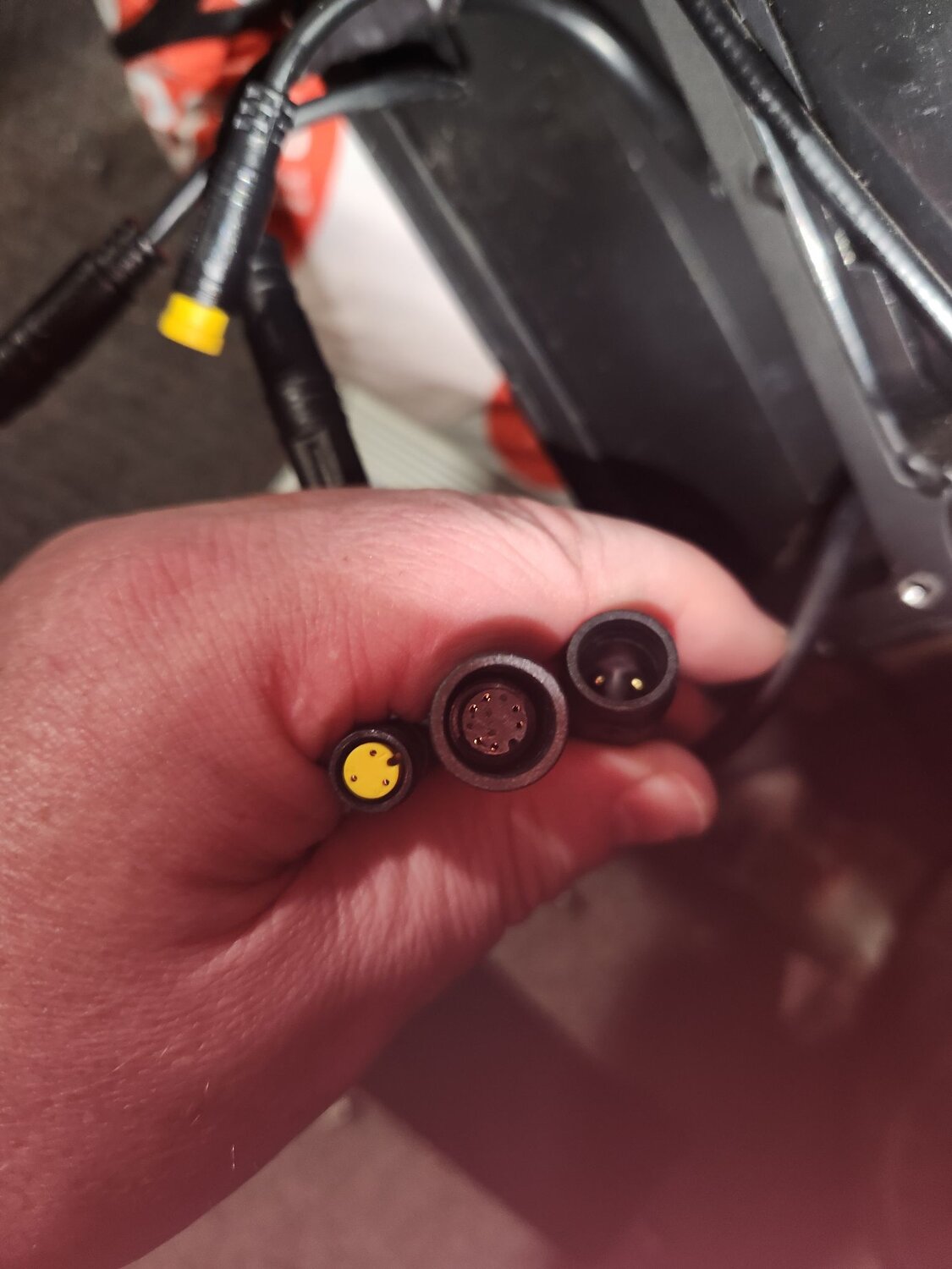 - 6 pin black plug to front of bike (splits into sever plugs for LCD/Brakes etc)