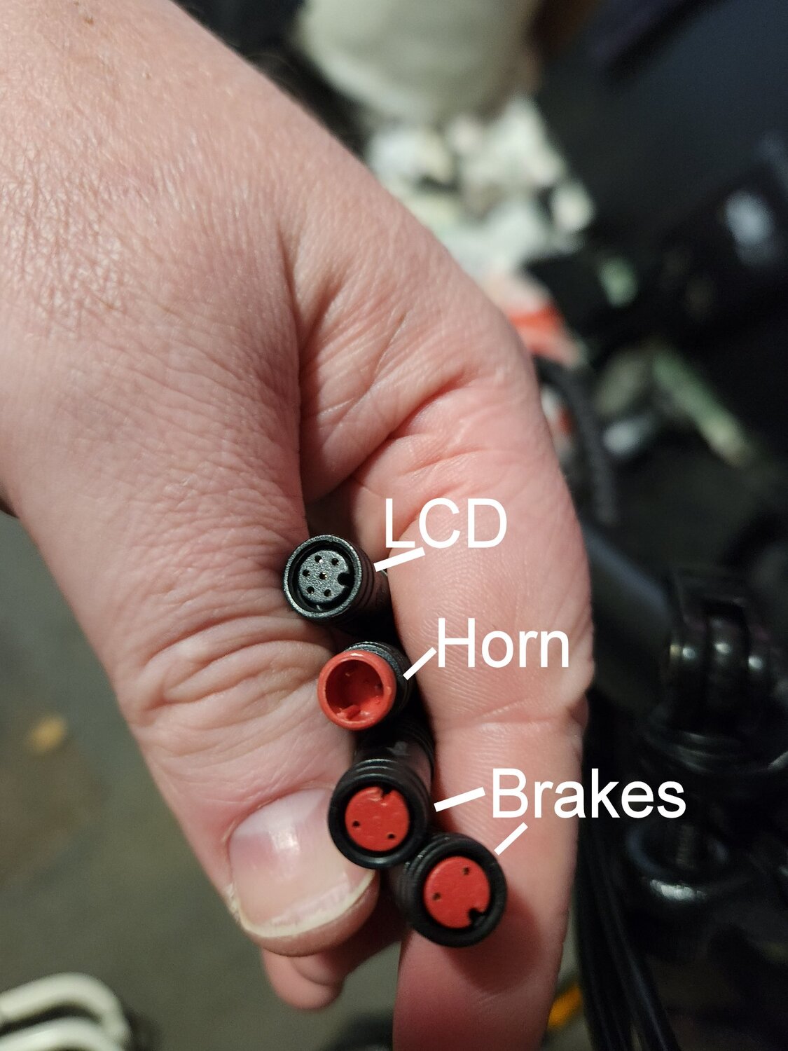 I've looked around and cant seem to find a replacement/sacrificial splitter cable (similar to this) that has the same plugs as mine; which is a 6 pin plug from the controller, that splits into 3x 2-pin (red) plugs for the brakes and horn (the horn is a male plug, the rest are female), a 6-pin (black) that goes into the LCD (OMT-M3) and a down facing wire from the splitter the the front light which is a male 3-pin (yellow) plug.