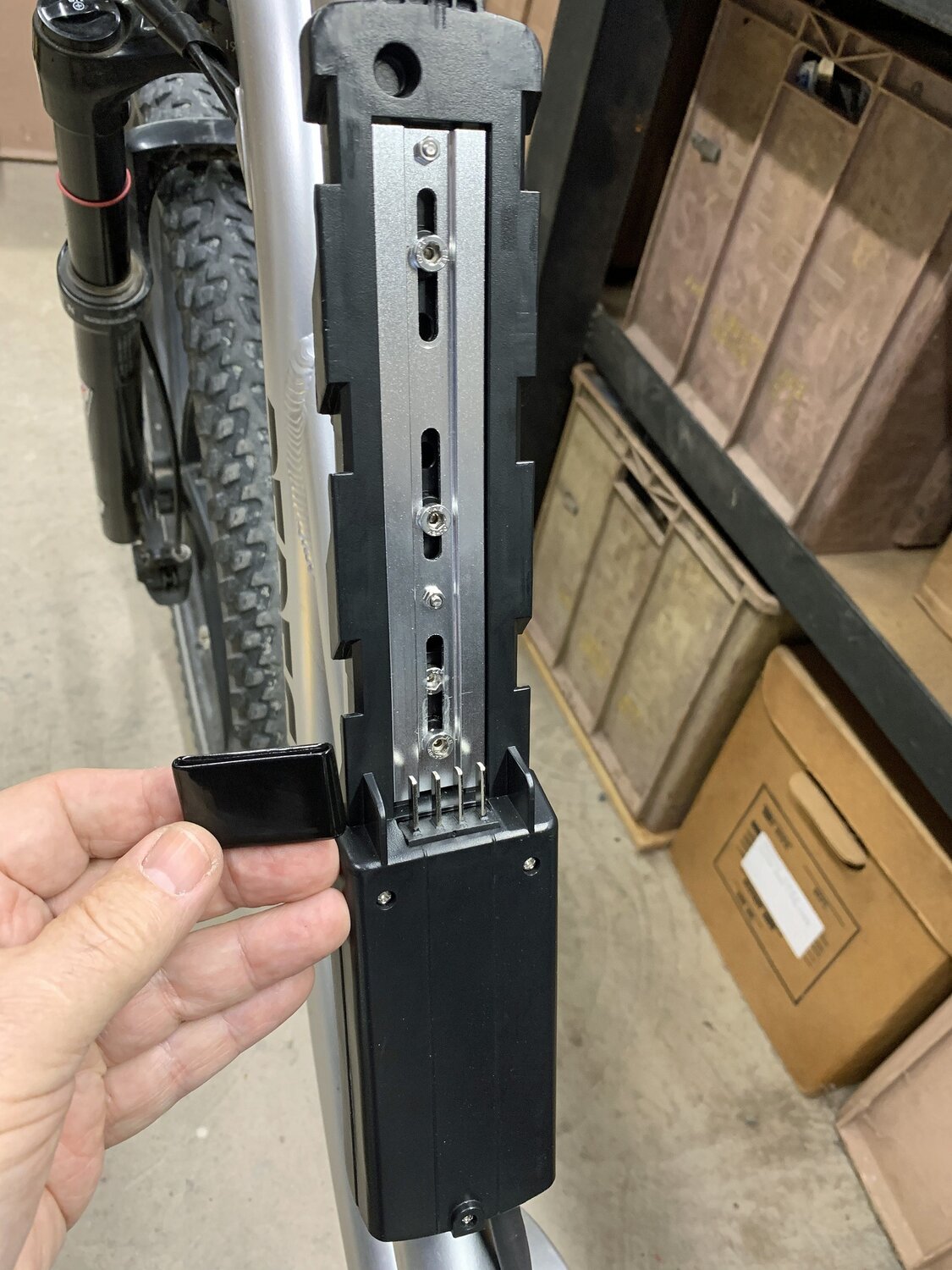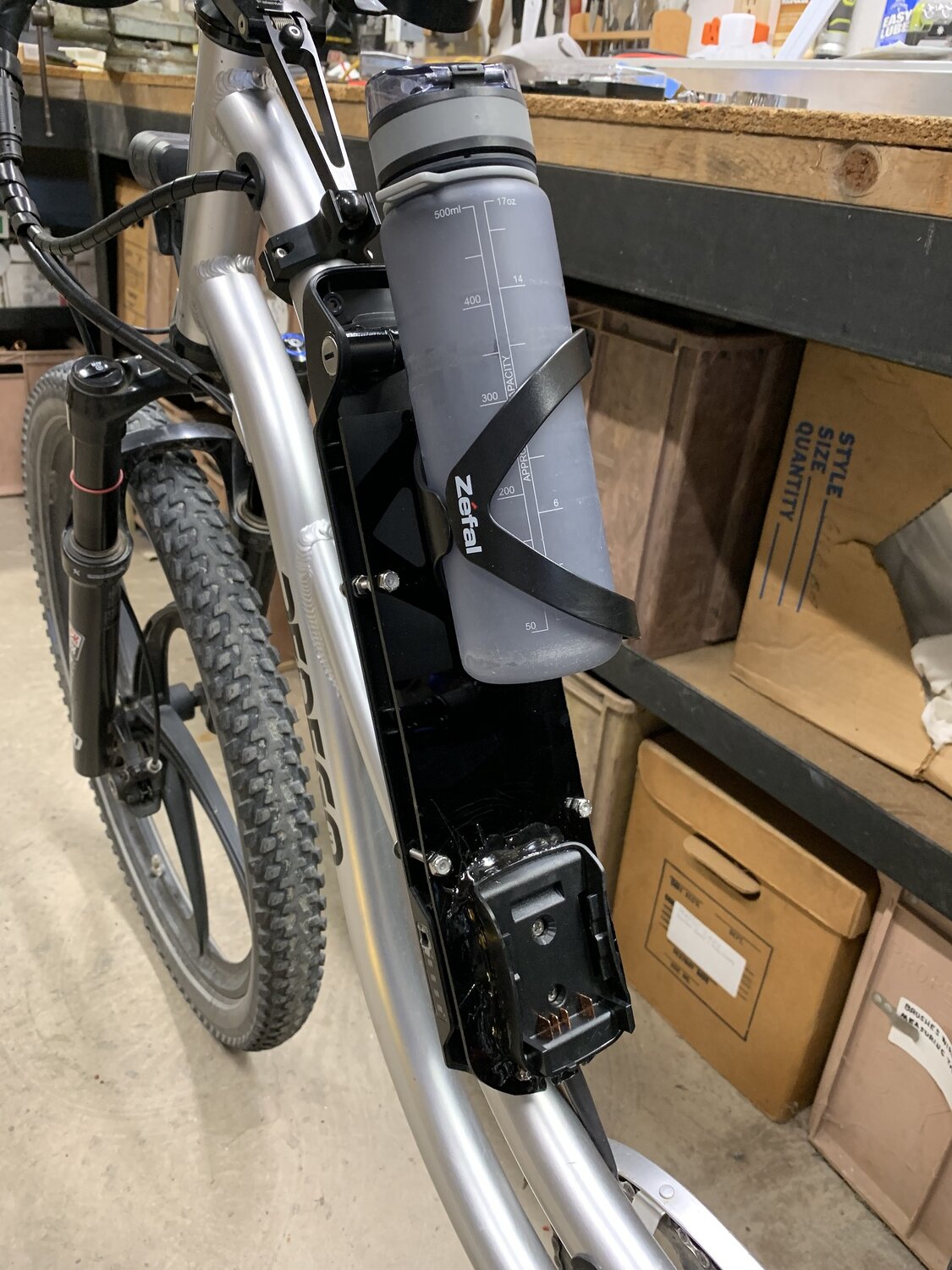 For rides that don't require extended range, I remove the dolphin battery and use this adapter. It holds a bottle cage and a mount for an emergency cordless tool battery: