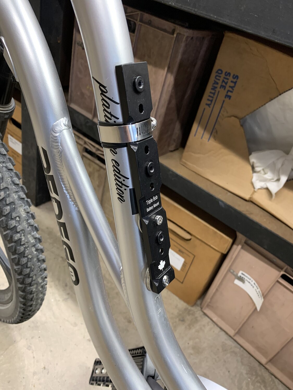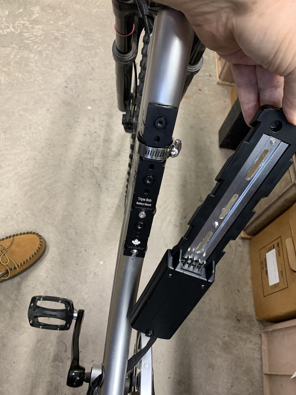 My bike uses a 10# rear rack battery and I carry the spare in a pannier. The bike is already rear heavy and carrying a third battery in a pannier would not be practical. Instead, I bought a Hailong 52V 20 AH "dolphin" style battery and mounted it to the down tube. It was surprisingly easy to do with kits from Grin that use the bottle cage bosses.