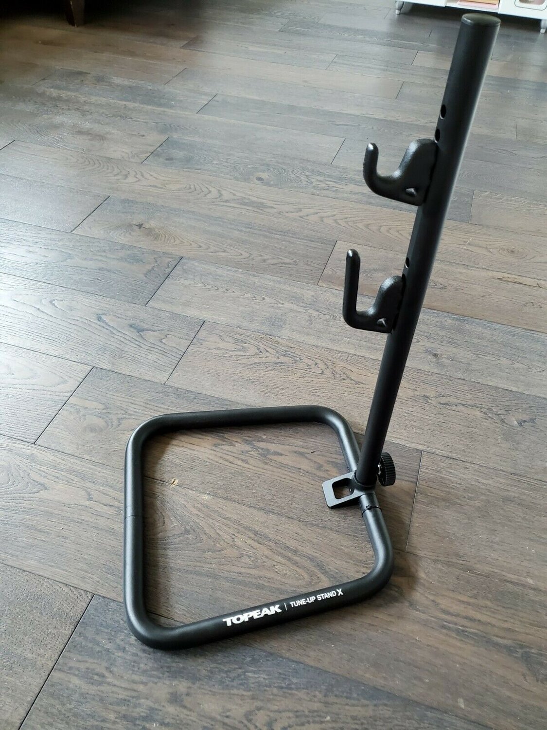 Received the Topeak Tune-Up Stand X today and I'm happy with the purchase. I have a nice Park that I keep in our summer location, and an Amazon special "Bikehand Pro" that I keep at our winter place. Both of these are a bit of a pain to get out and set up and are more than needed for quick adjustments and cleanings. Also either of these take up too much space in our motorhome during our travels. The Topeak breaks down quickly for easy storage and it's perfect for probably 80% of what I need a stand for. It's weight rating is 55-lbs, but since the full weight of the bike is not carried by the stand it should handle even the heaviest of e-bikes. It holds our bikes solidly - just a little more tippy in the direction of the post, but not bad.