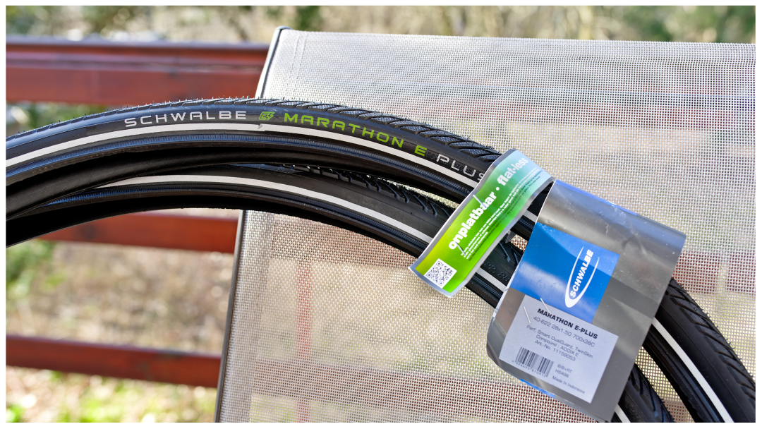 Schwalbe Marathon E Plus tyres.