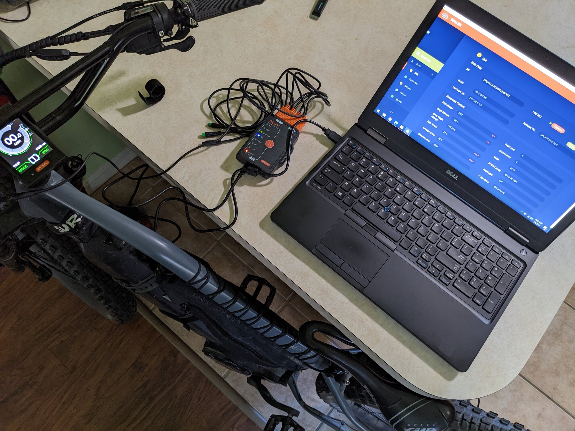 I can(bus) now at least read the canbus protocol. I was able to install the BESST software, hook up the BESST tool and get a live read from the display. I'm still having trouble reading the controller, but I've watched a troubleshooting video about that somewheres on the youtubes and will be playing more with this in the coming weeks. Very excited to at least have a working canbus connection at the moment. Now if I could just get my hands on a stock firmware file as a failsafe I'd feel much better about playing around with it. (Don't tell my wife I had the bike in the kitchen)