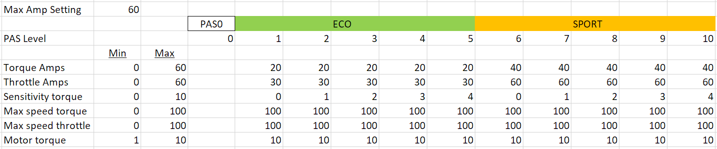 If display shows your current/power draw then you maybe could try setting sensitivity torque higher to make it easy to hit the max current given my the torque setting, keep all torque levels the same, then see if your current & power draw scale up with each assist level. Only issue here is motor torque setting - looks like there's 10 or 11 levels instead of a percentage like the torque setting? Might make it hard to match that value and we don't really know what conditions determine 'starting' - is it a timer after rpm>0, is it a timer once torque is exceeded, or a cutoff above a certain rpm? I skimmed through