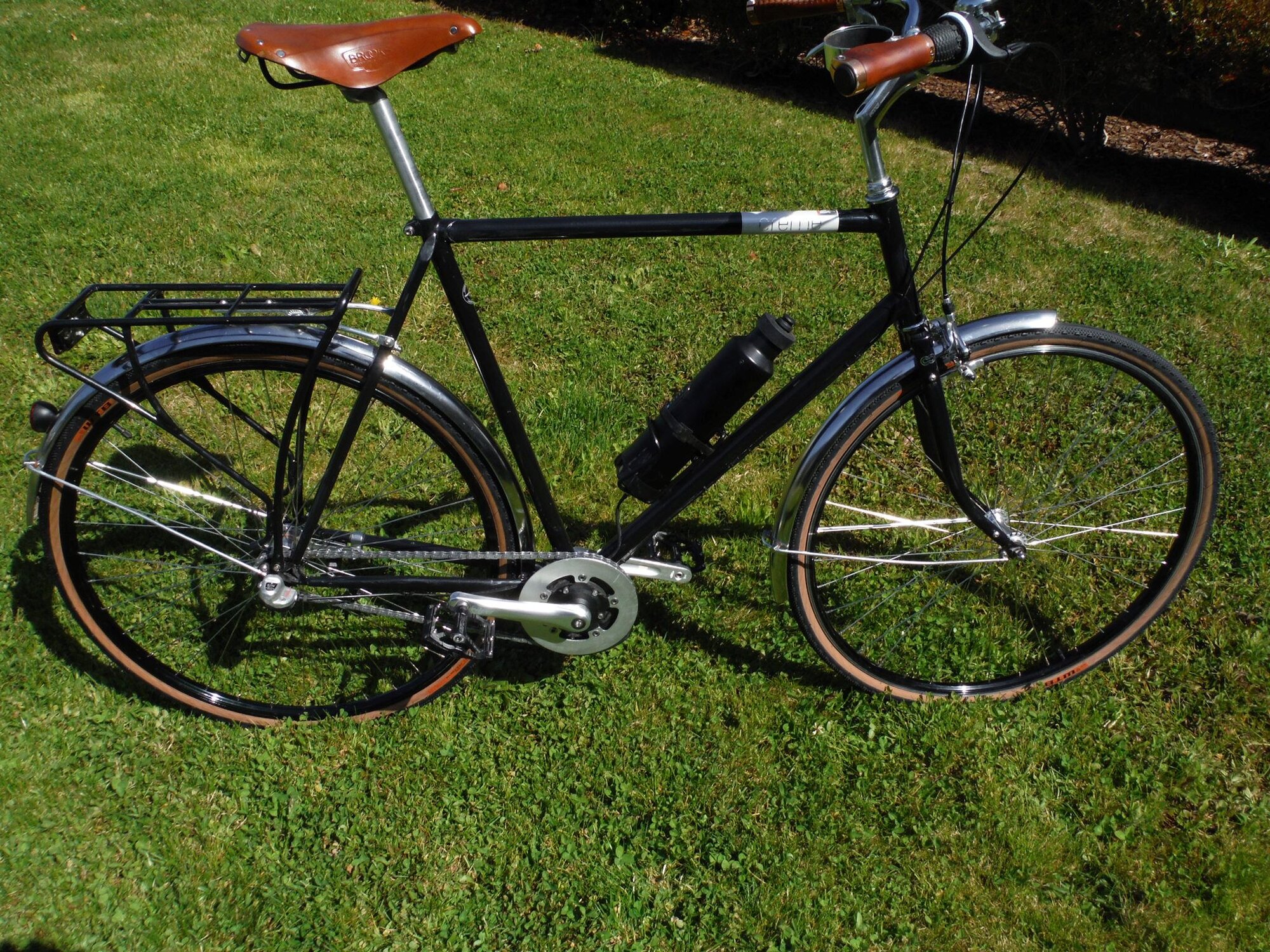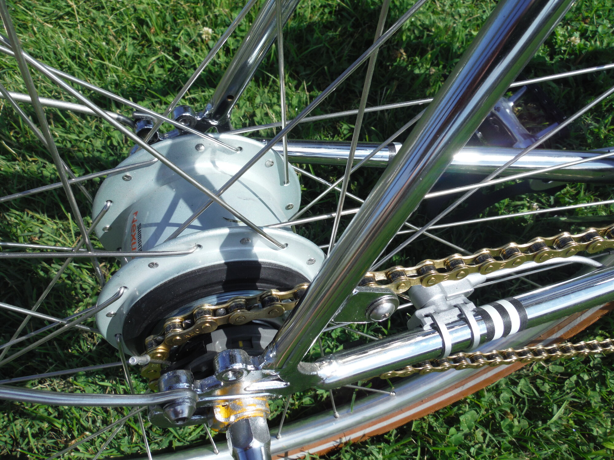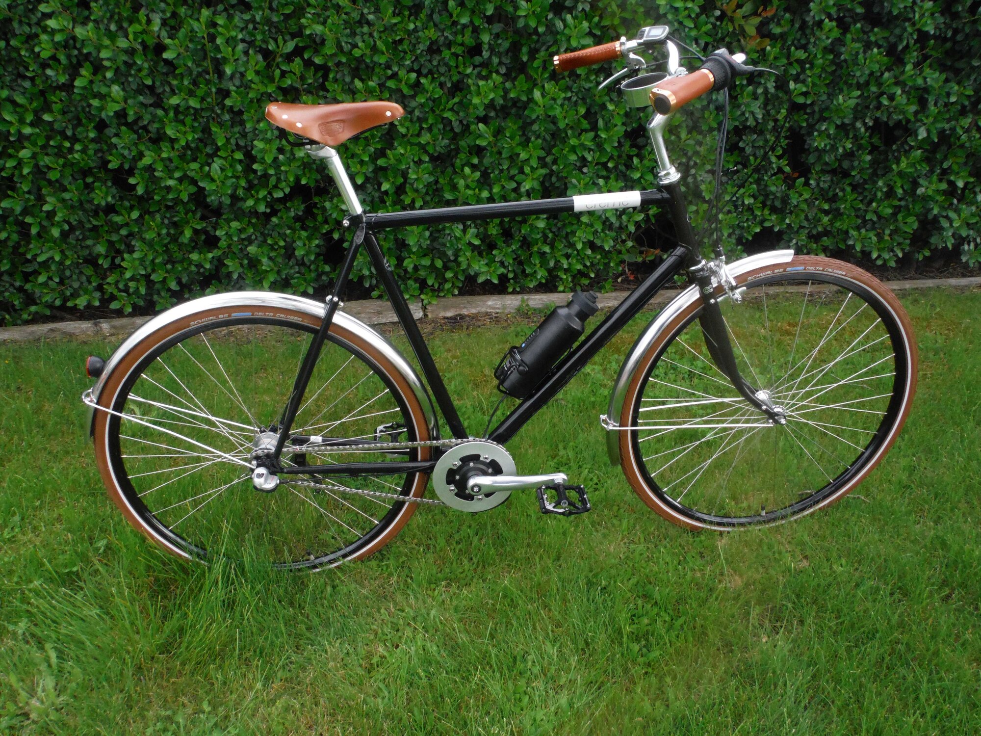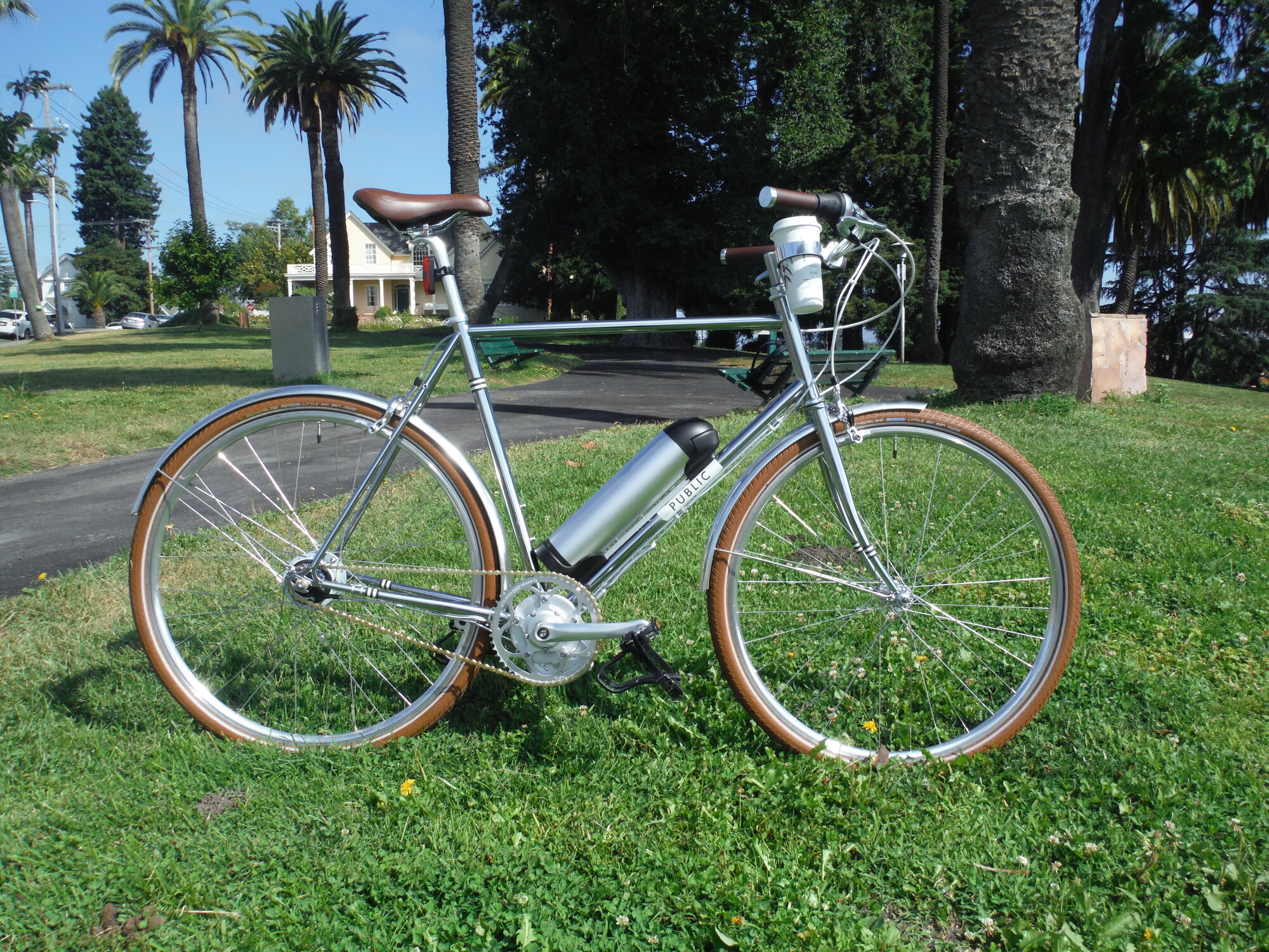 I am not embarrassed that they are electric, but non-bike folks can't recognize them in plain sight and that is fun. My first one was like a first pancake you feed to the dog. It was clunky with a big battery, messy wires and had a ghost pedal motor with a throttle. By my twelfth they became more refined and almost all had torque/cadence sensors set up so you get more power with both higher pedaling pressure and higher pedaling speed. My fourth one still had extra-wire at the base of the down tube. You can see it painted silver. But they were getting better and better. Here is that fourth build. It had a chrome frame and an 8-speed IGH. I told the mom of a guy on the design team of Specialized, that it is called Creo Eater when she asked its name.