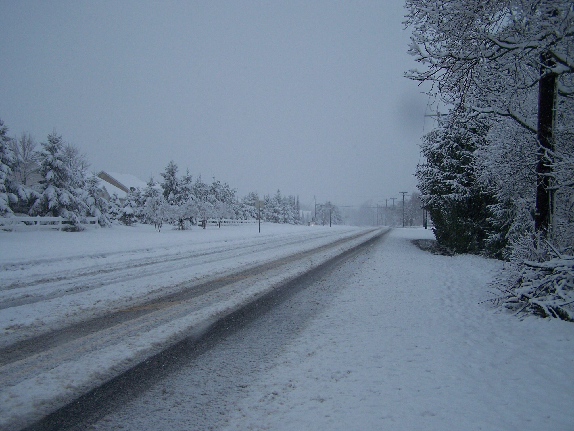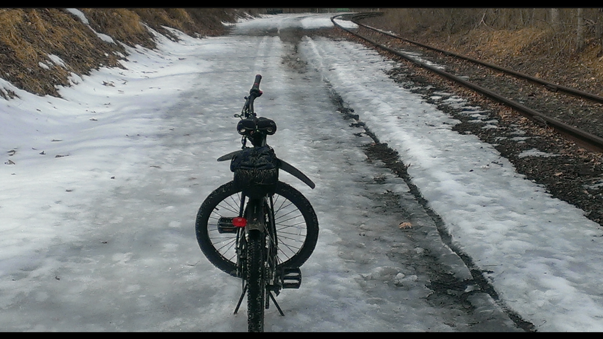 This is a county road in southern New Jersey. The designated bike path is under the white snow, several feet from that outer tire track. Aside from the dangers of riding a bicycle so close to motor vehicles on the edge of their own traction; the other big issue is the chemical treatment the County lays down prior to every forecasted snow storm, as well as follow up salt and brine applications during plowing operations. For myself, none of that is worth going out for a post storm spin.