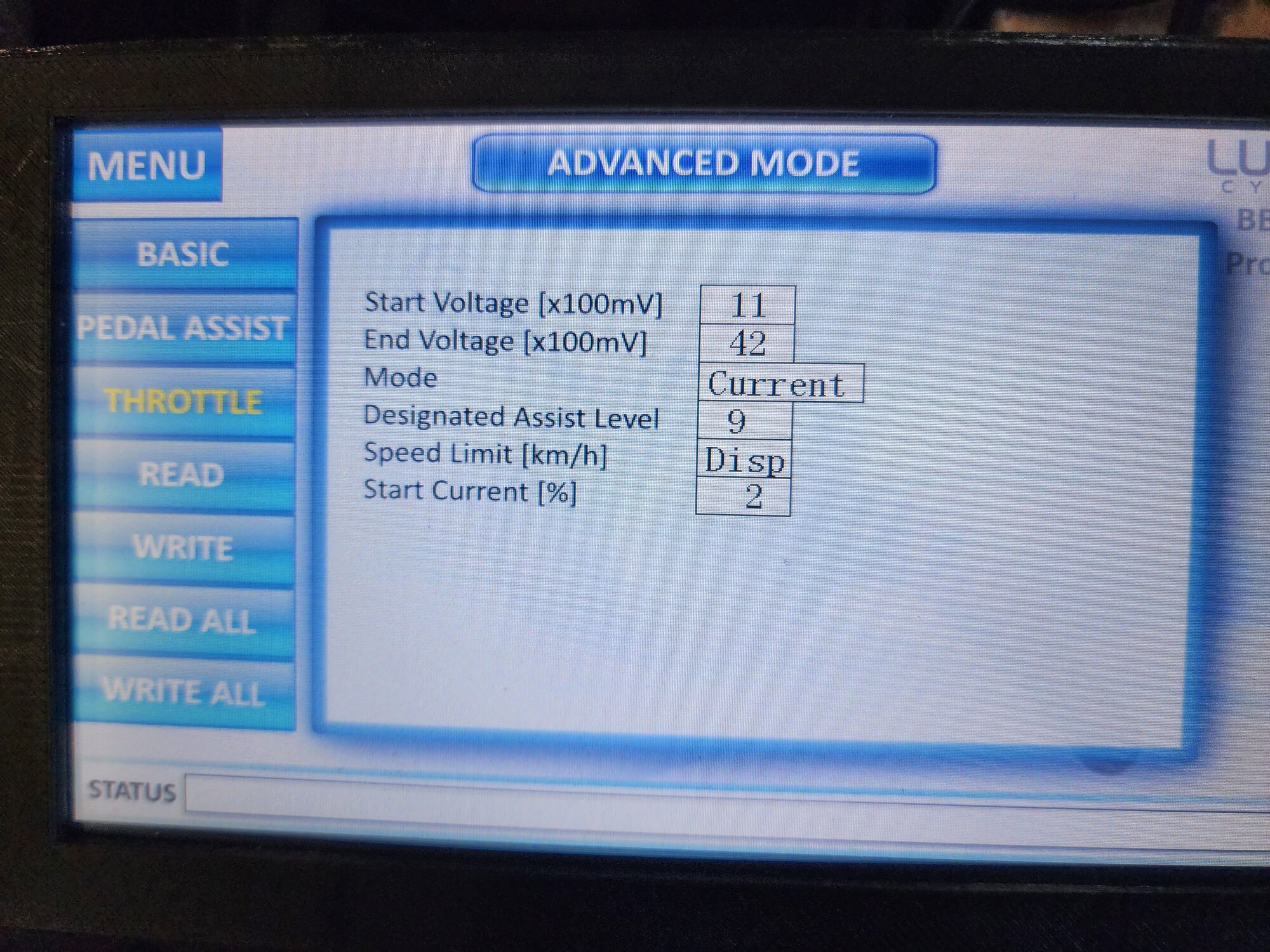 Not a lot of science apparent in this speed % progression, but it is the product of a fair bit of trial and error. I picked 100% for PAS9 and reduced it by 7 at each level down until I stopped at PAS1. What this does is, in conjunction with the other settings on the Pedal Assist tab, create motor behavior that is more conducive to dialing back power when I am at high cadence while also at lower assist settings. I usually run at PAS 3 for a normal cruise. If I decide I need more assist the settings give me a steady increase while at the same time providing more and more insulation from the current decay and keep current pullbacks. I'm a lot less likely to want to conserve power if I am pouring on the higher pas settings out of some need to crank them up.