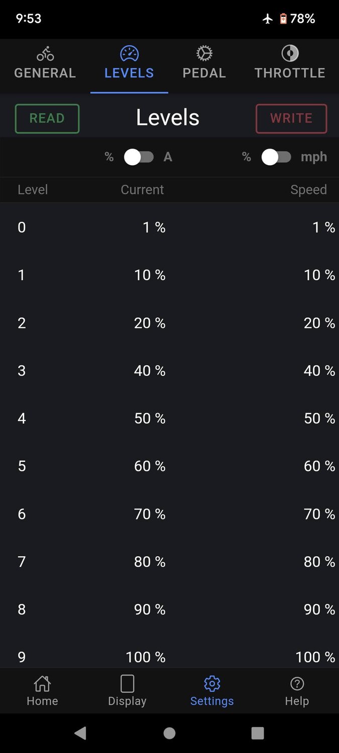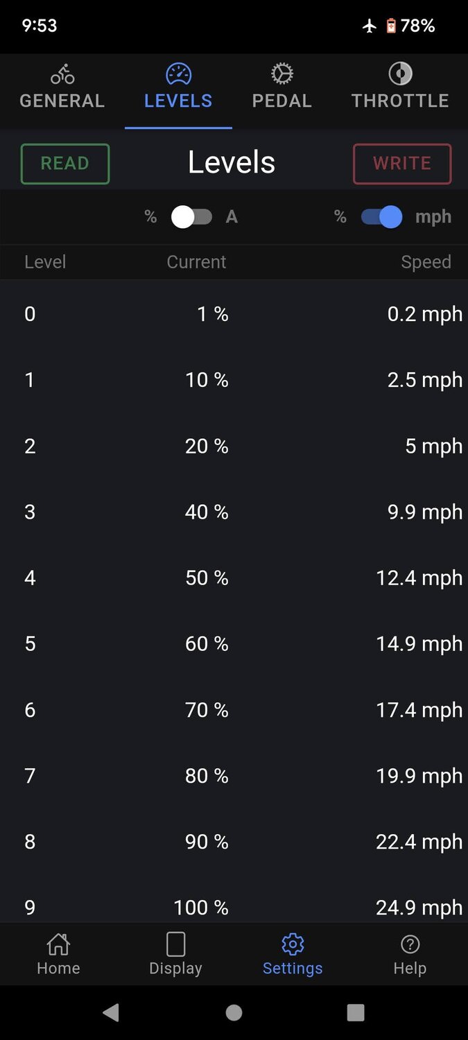 this thread on endless sphere, which is speed at 100% on every level and the power incrementing by 10 through 9 levels of PAS. like this: