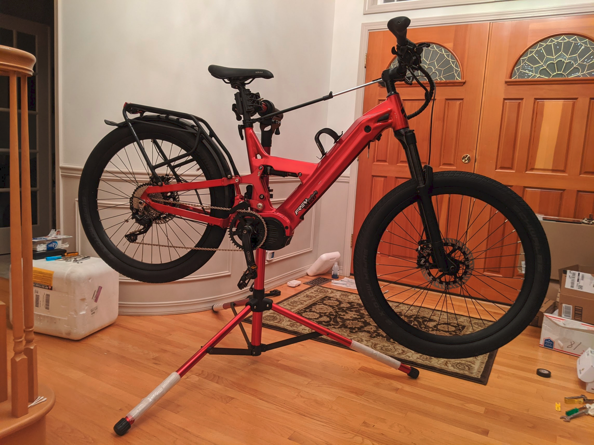 Please excuse the bike in the picture, but this is my ancient Park Stand that I’ve had since about 1990. While I have not had an e-bike in it yet, I have used it to service my Gary Fisher Gemini MTB Tandem, and my Rans Rocket Recumbent and the Rans V-Rex that I just retro-modded. So the heaviest bike was probably the Gemini at about 50 lbs all up and cantilevered but supporting the Stokers Seat tube and leaving the fork or the front wheel on the ground.