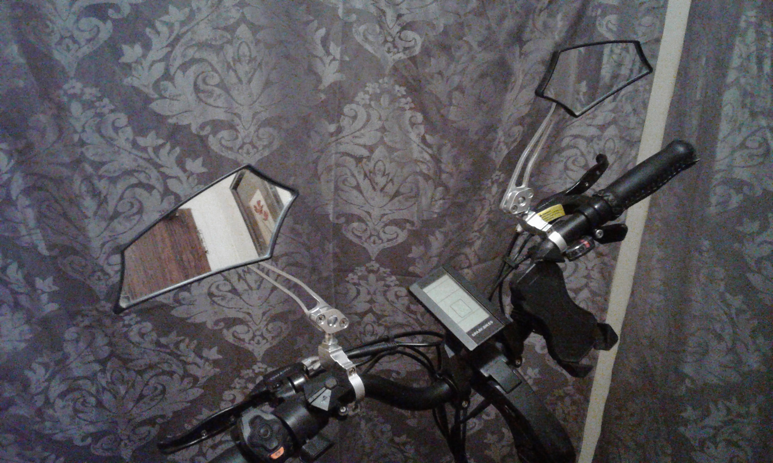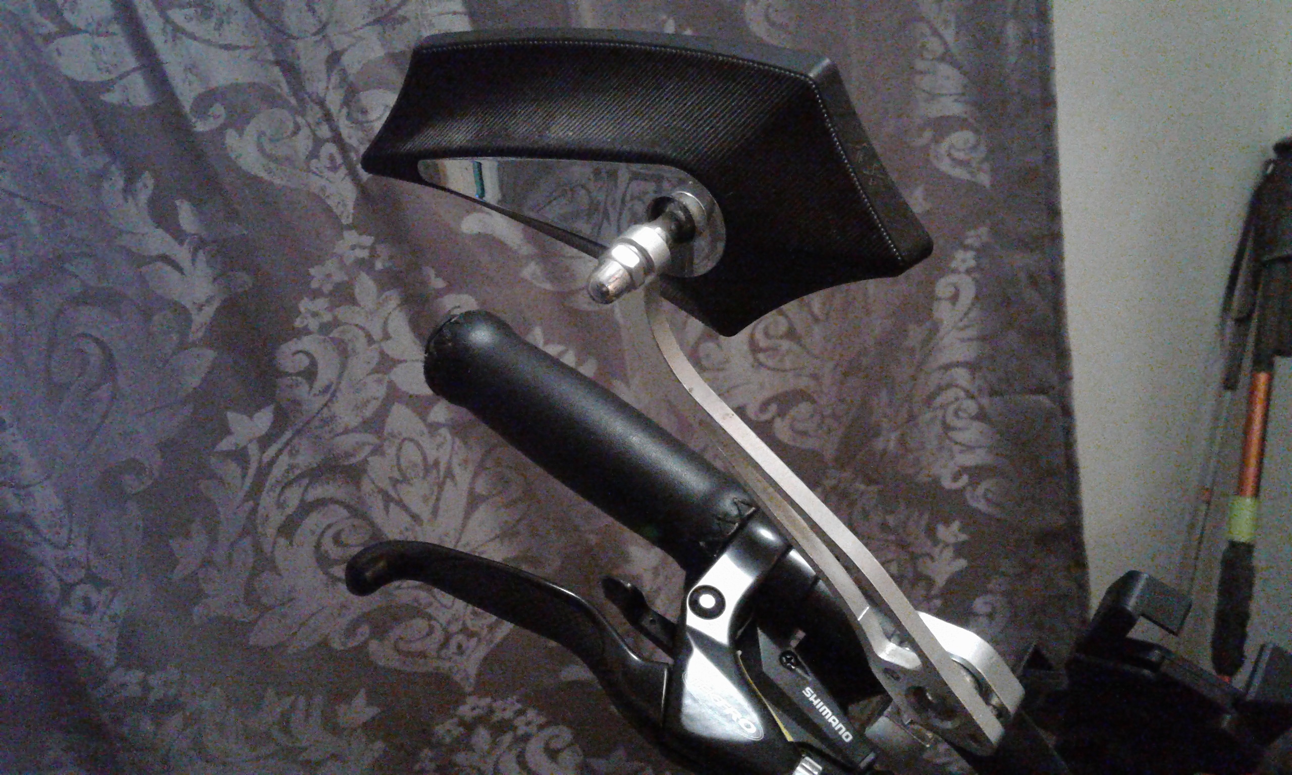 I use motorcycle mirrors. They're great because they stay in position on bumpy roads. They're solid alloy and have ball joints on the back of the mirror and where it attaches to the handlebar. They don't take much space on the handlebar and can also be mounted on the tip of the handlebar grip. Over time they can get a bit loose, but it's easy to tighten the joints with a small wrench. I paid $20 CAD on Amazon for these, you can find them in all sorts of shapes, sizes and colours.