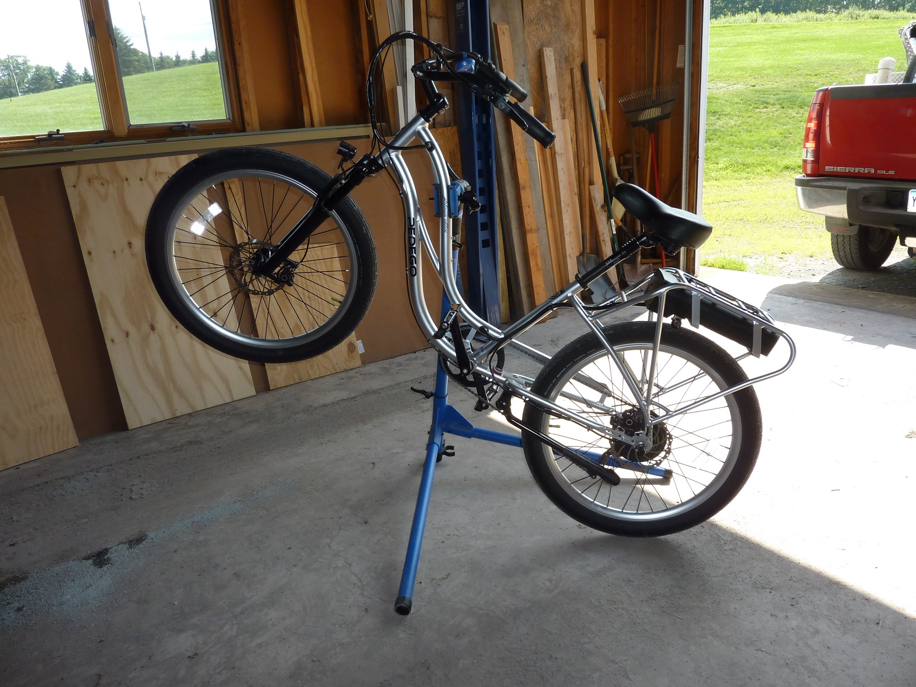 Success!! A little, anyway, in terms of getting the back wheel elevated, and A LOT in that I did it by myself.I used a piece of pipe to get more force on the pivot clamp. Here is a photo of the pretty daylight shining underneath my rear tire. View attachment 24551