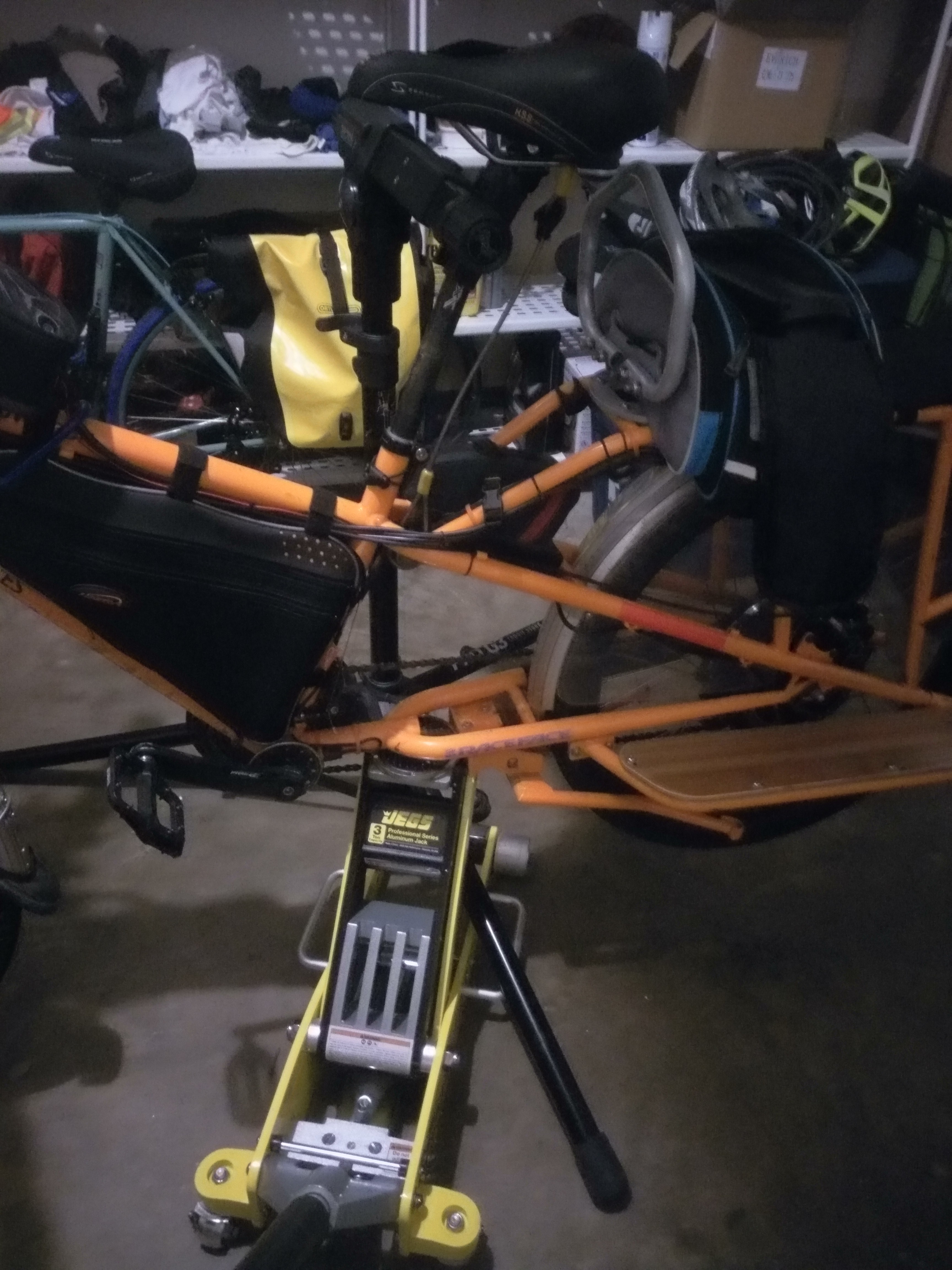 To get a bike up onto my Park PCS 10 work stand, I lift the lighter front end of the bike and set the front wheel on a milk crate. I then attach the clamp, remove the crate and pivot the bike up off the floor. This way, much less lifting effort is required.