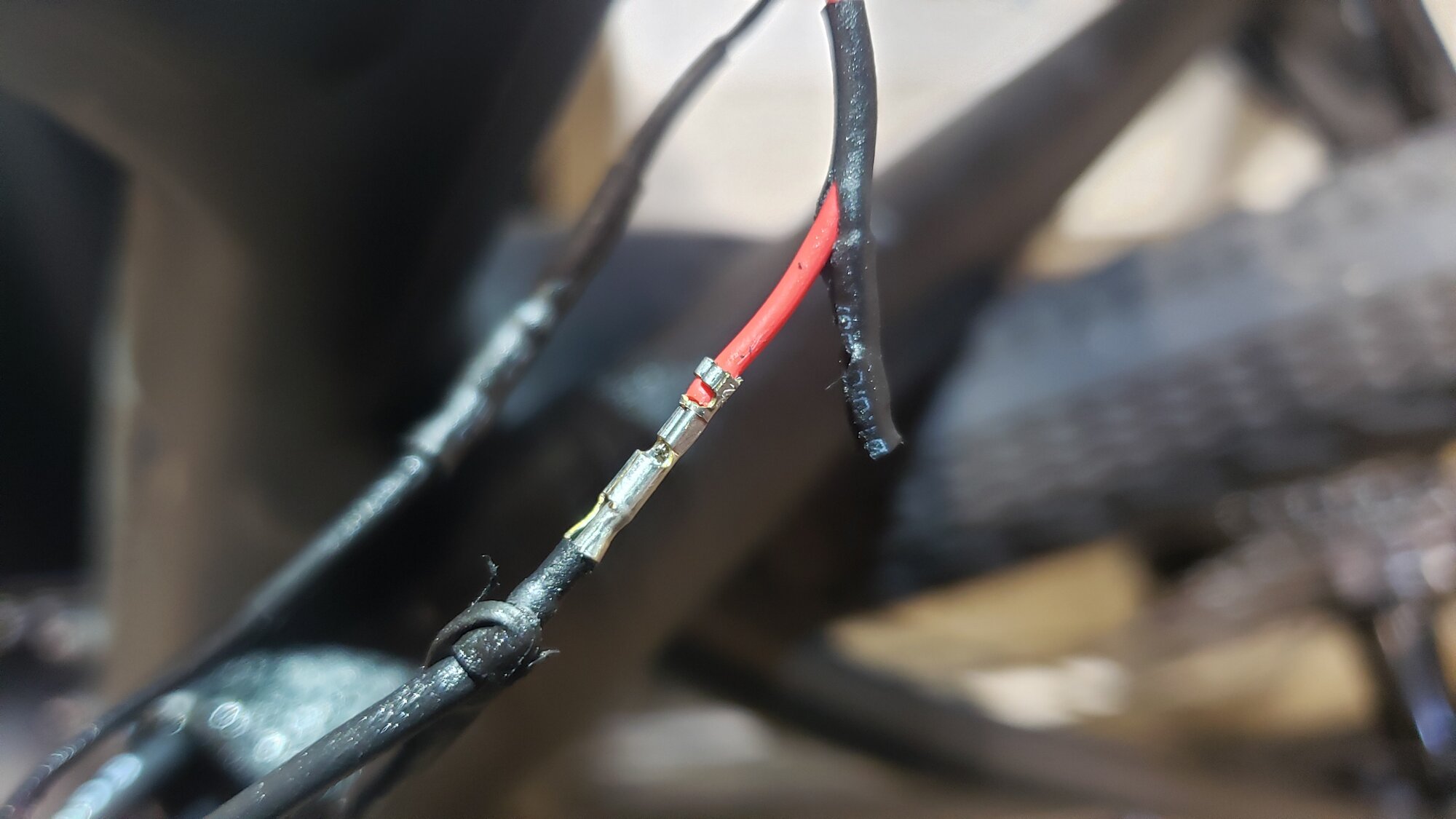 So I decided to solve the problem like an unsophisticated gorilla and just yank on the cables. Turns out they're little skinny interfaces, probably to reduce friction so that you don't need pliers. I was able to separate the wire ends with my finger tips. Got the new seat post installed and the old seat back on.