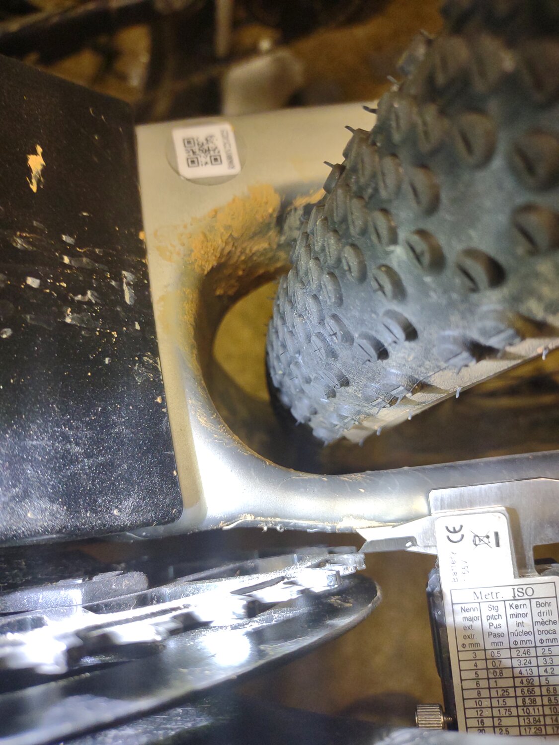 Here is the real pics of the chainring clearance on a medium Canyon Grail On frame, Again, I have been using the 46t and it cleared a 48t see tech details above. Measured with a 46T it had 4mm (see where I used the calipers to measure and if you are using a narrow wide chainring be sure to measure at the wide tooth :) ...) , of clearance. Still am waiting on the 48T narrow wide chainring to try when I get back to colorado. But, again so people don't get the wrong information. This bike in at least a size medium and probably larger will fit at least a 46t and maybe even 48-50. (I am not going to test a 50t on it because there is no real reason to) I can get out of the saddle and sprint (thanks to speedbox), up to my normal sprint speed with the 48t. Disclaimer, I am not a sprinter I am talking about when the wild and wonderful accelerations happen in the pack and one needs to quickly bridge from a large gap, back to the draft.