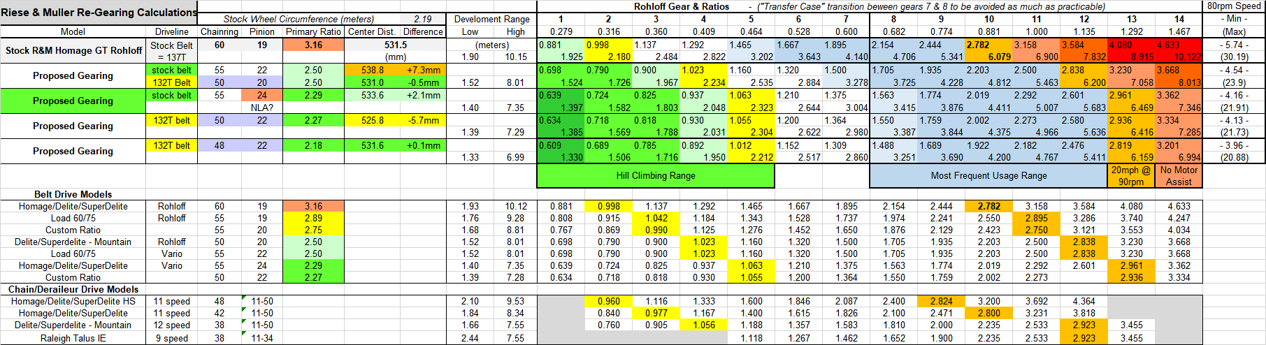 The lower blocks in the spreadsheet show various gearing combinations for other R&M Full-Suspension models, including all three of the primary drive options (Rohloff, Nuvinci, & chain), a few custom ratios using cogs R&M uses across the modesls, as well as my previous E-bike's drivetrain thrown in for me to be able to compare them against another bike that I am familiar with.