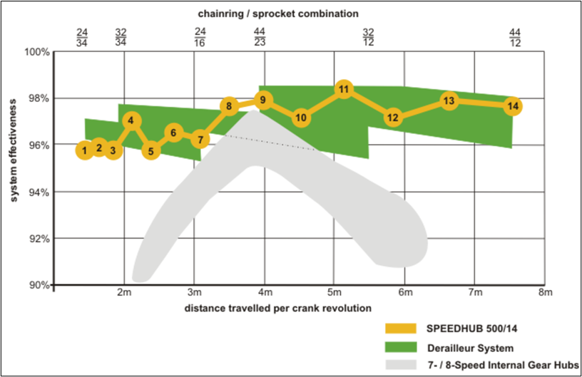 Another factor to take into account when using the Rohloff hub is that it is more efficient in the upper 7 gears,
