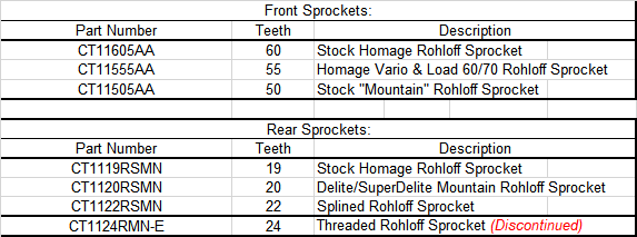 The upper block shows the current stock Homage/Rohloff/Gates gearing and the resulting gear rations and development for each gear of the Rohloff hub.