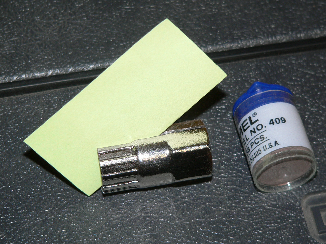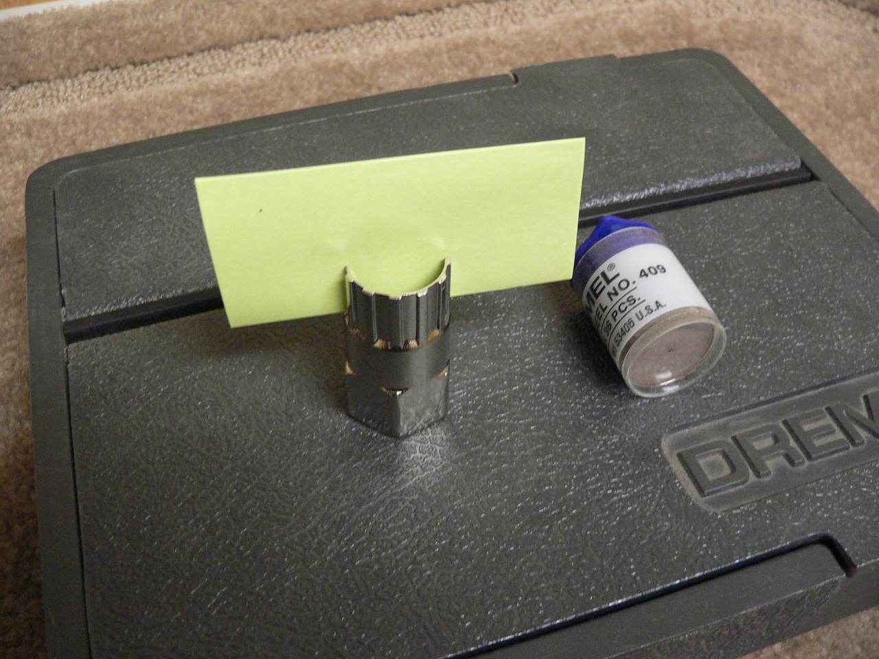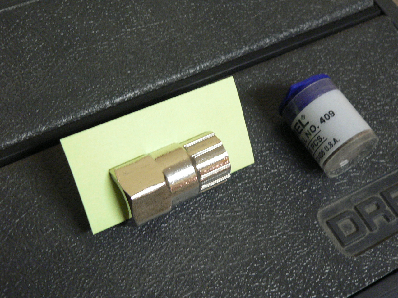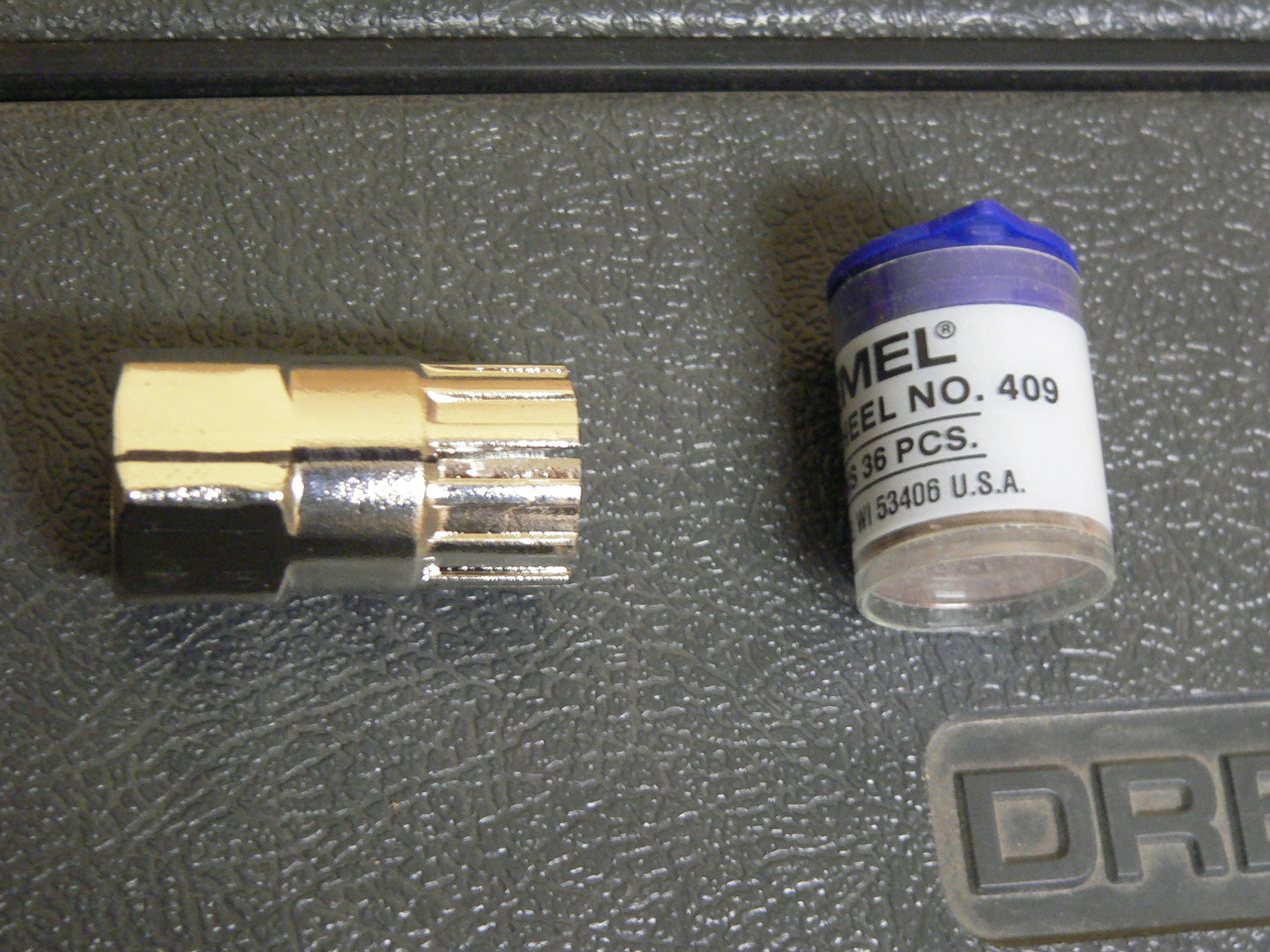 Once I determined that the tool would have to be split, I dug out my 30 year old Dremel tool and got to work. My Dremel uses the small 15/16" diameter cutting wheels, and I had some #409 wheels on hand. They worked fine for this job. I used one wheel on each side. Cutting the DNP tool was not hard - it just takes a little care and patience to make straight clean cuts. I wanted to remove as little material as possible, so that the tool would still fit properly after being split. It worked out great. Photos below show the progress of the cutting from start to finish.