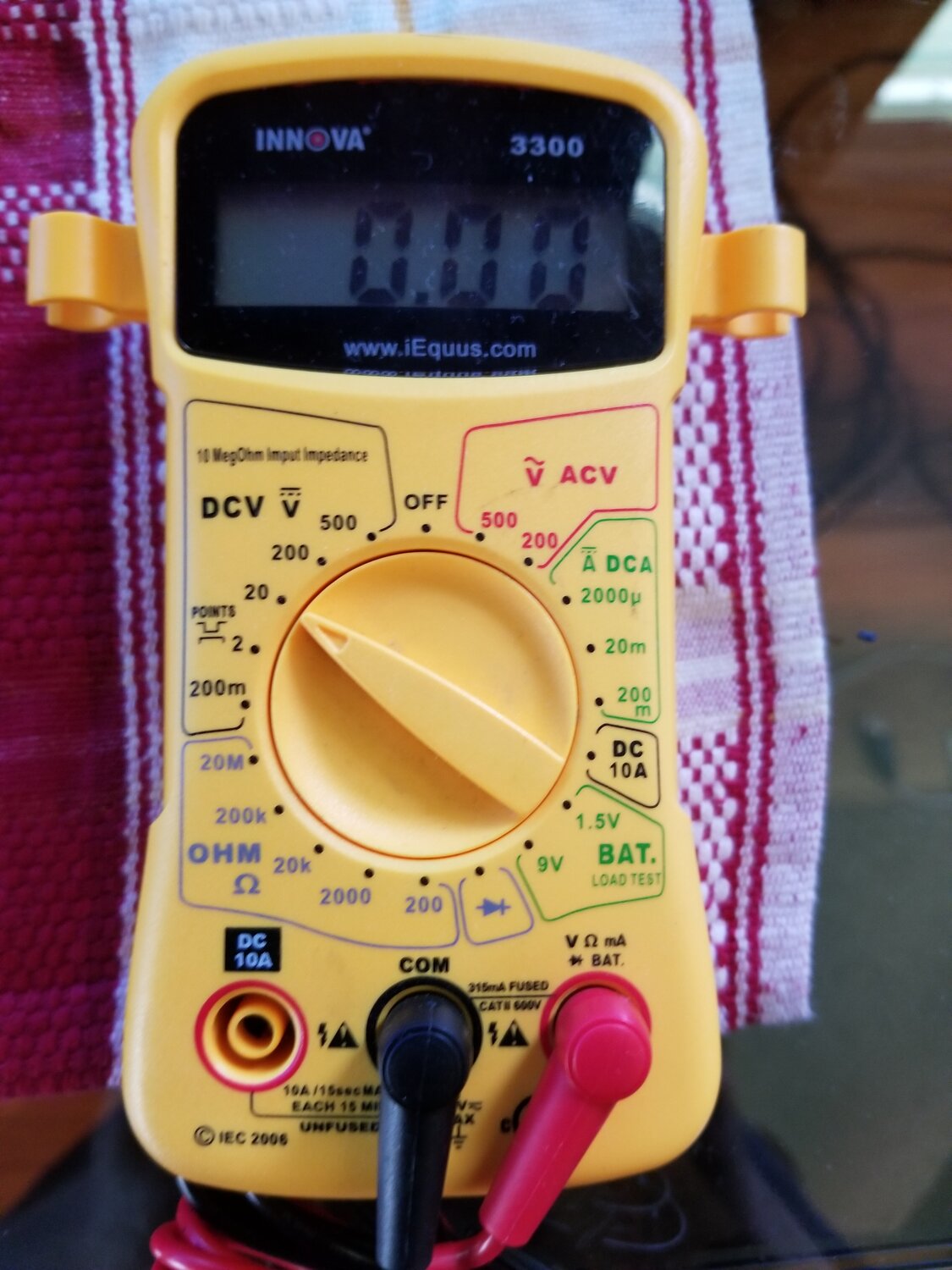 Right now, this setup work for continuity checking and when I am checking the voltage on the batteries. At the bottom LEFT of the voltmeter is a DC 10A slot and I am unsure about that part even though I haven't used it before. I am hoping the way I have it right now is the way I need to do the checking.