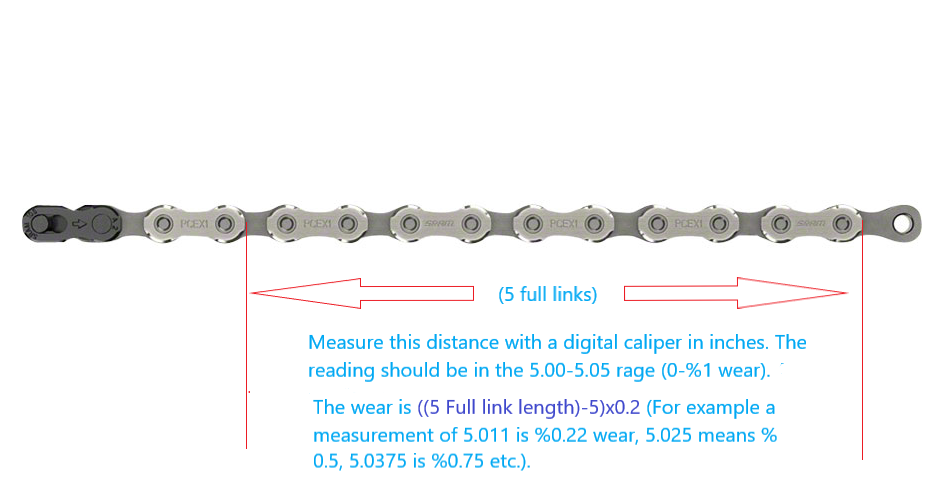 So with a digital caliper with standard knife edges I measure my chains the following way. While the chain is under tension (measuring it on the bike is the best) measure 5 links from outside(every full link is 1" initially) since most standard digital calipers are 6" max this is a good length to get consistent measurements.