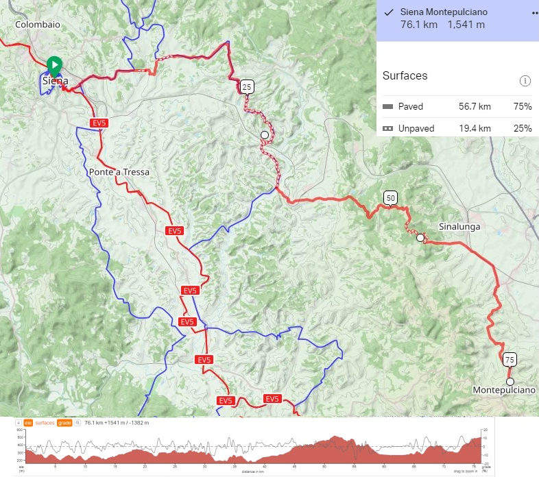 Mere 47.3 mi with over 5,000 ft of elevation gain. Some rough roads on the way. And up to 11% grade climbs. Are you with me on those funny rented Italian e-bikes? :) Because I would immediately rent a decent e-MTB or a strong commuter e-bike there :)