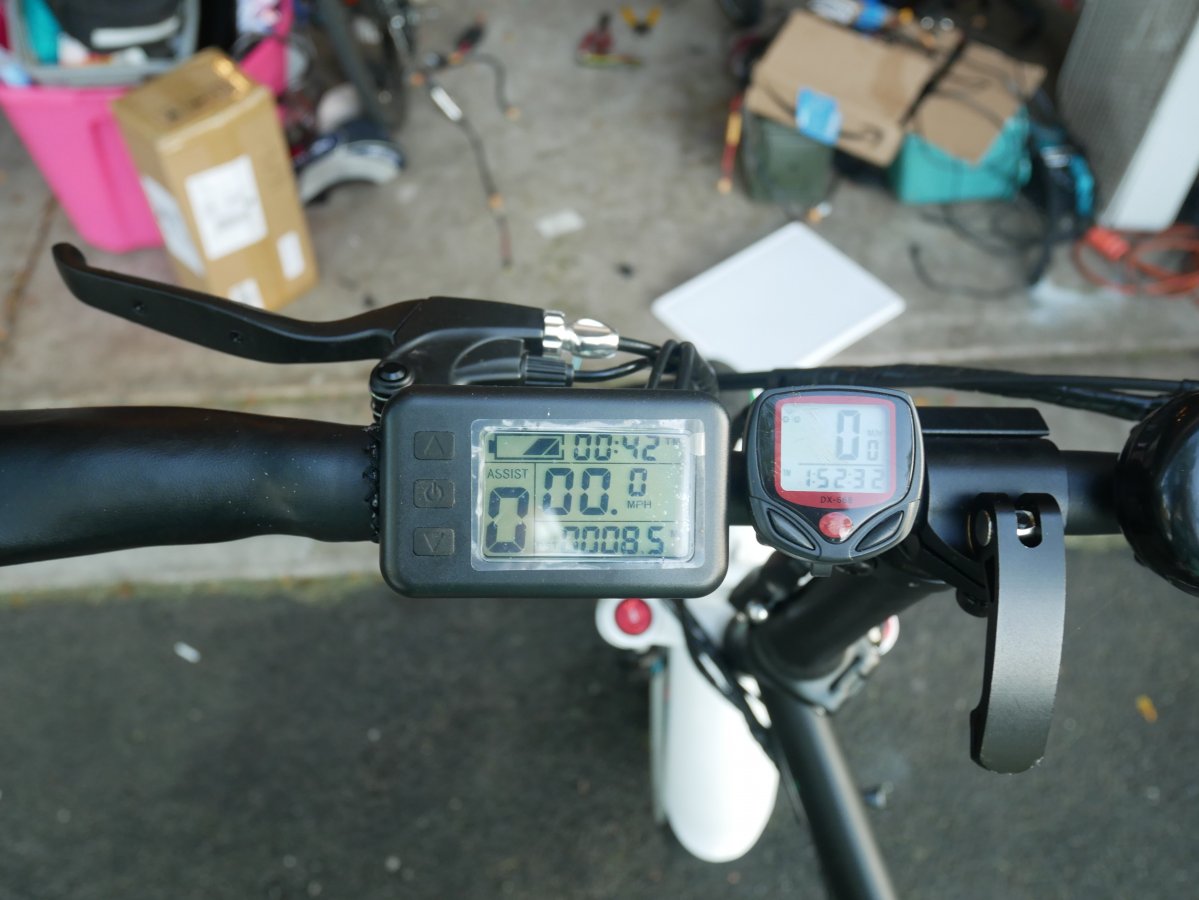 I attached an inexpensive speedometer on the Ecotric (link below) that has a sufficiently long wire to work even when the handle bars are fully extended. You just have to update the wheel circumference on the inputs (in MM), so I finally was able to apply my high school geometry skills. 23 inch diameter wheels x25.4 (1 inch = 25.4 MM) X Pi (3.14159) to calculate tire circumference, so the Ecotric’s 23 inch diameter tires have a 1,835 MM circumference. The linked speedometer (and bike computer) below has MPH and KM/H.
