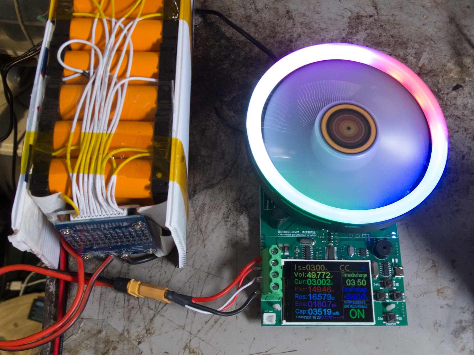 There's other ways to test discharge. I bought an Atorch load tester which allows one to choose the current and how low to run the battery. It's limited to 160 watts, so a 48V battery can't be discharged higher than 3 amps, Thesea are aboyt $40 from China and 2x higher on amazon. The glowing disk is a cooling fab, festooned with LED's. This is more accurate than the above, but the tool is pretty fragile.