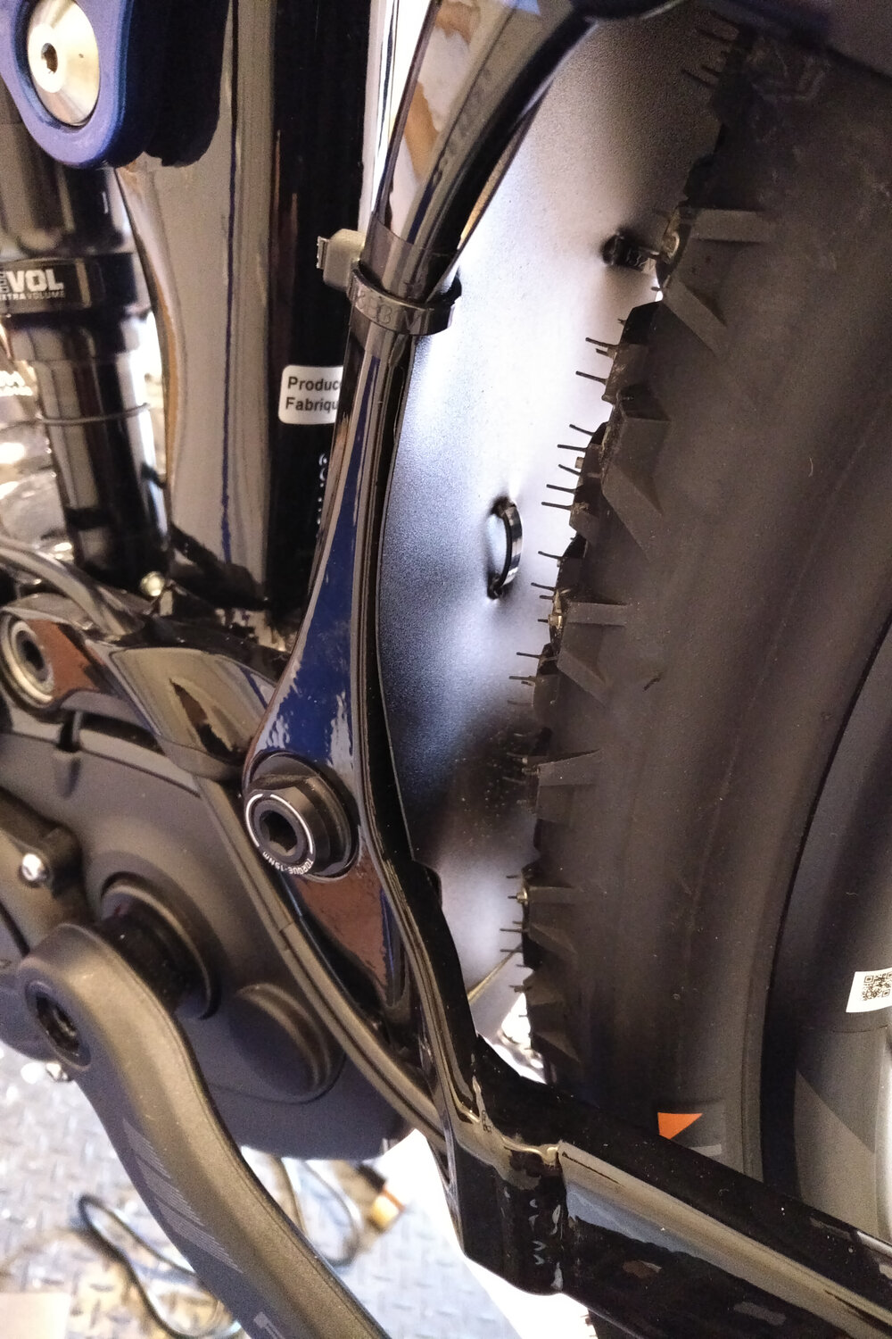 To help keep grime off the lower pivot points/drivetrain, I cut out and shaped an inner fender liner from an old plastic school binder, formed it with a heat gun and also zip tied it to the pivot arms/bridge. The bike is also equipped with 45Nrth Gravdal Wrathchilds which were the only studded tires that I could find for the 29er. I hope to get out in the snow over the weekend to sample the merits of these latest add-ons.
