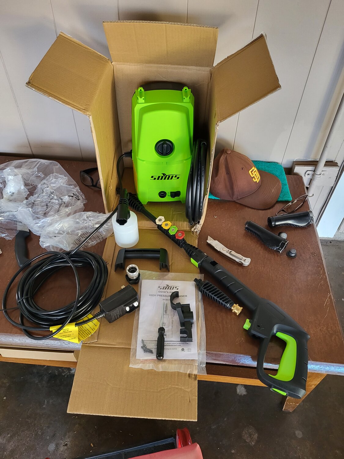 This was delivered today, 1900 psi pressure washer with too many attachments. I ordered it to clean my ebikes and pick up trucks and for general cleaning. Unboxing it was easy but after half bottle of California red wine and smoking pakalolo. I think I can wait for Saturday to figure out what all the attachments are for.