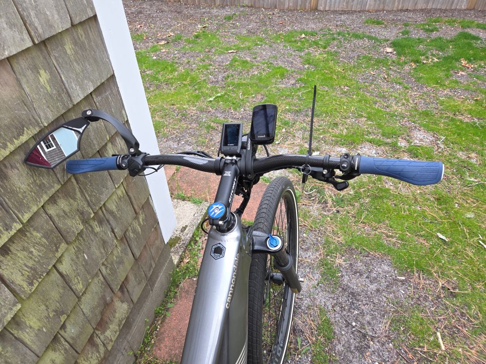 Specialized Comp MTB shoes. I can't ride too far without cleats. Up front, I swapped that horrific adjustable MTB stem for a Ritchey road stem that I had hanging around, along with a modified expander plug. Then I added carbon bars and Ergon grips to it, as well as a Hafny mirror.