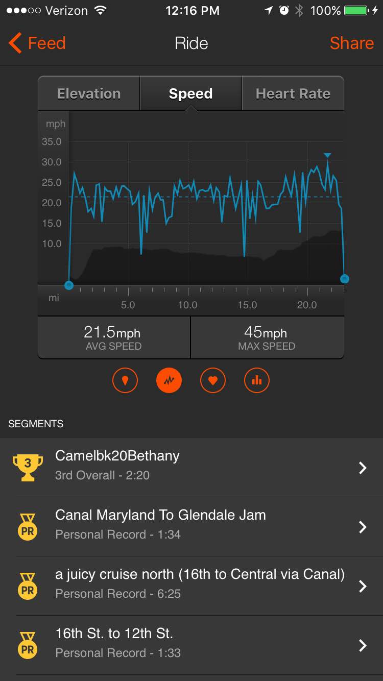 I rode it 23 miles home from work yesterday, at an average of 21.5 mph. I cleared 30 mph at least once, but mostly took it pretty easy to make sure the battery would last the whole way. The display still registered 2 miles of range left when I got home, despite a nasty headwind and 500' overall elevation gain. I left it on Sport mode until the last few miles, and then put it into Turbo once I knew I was really close to home.