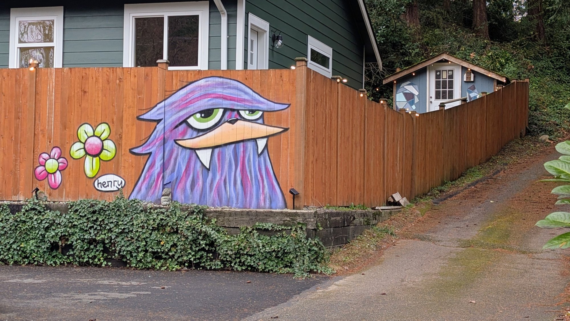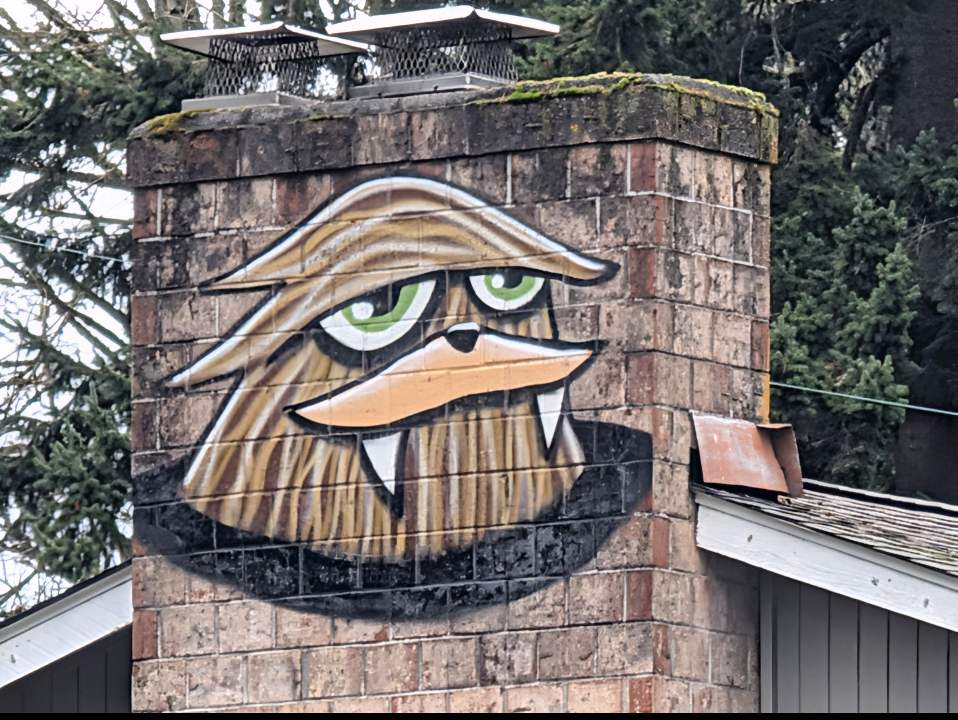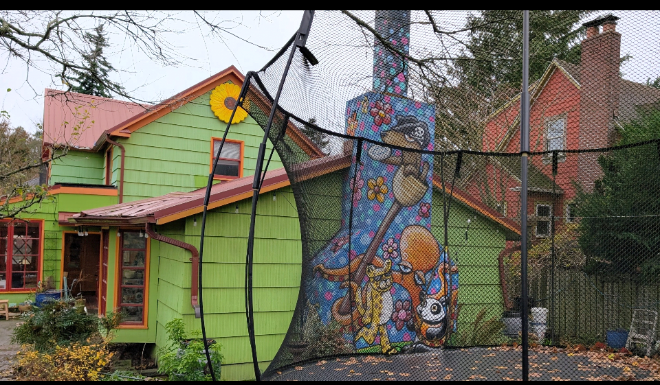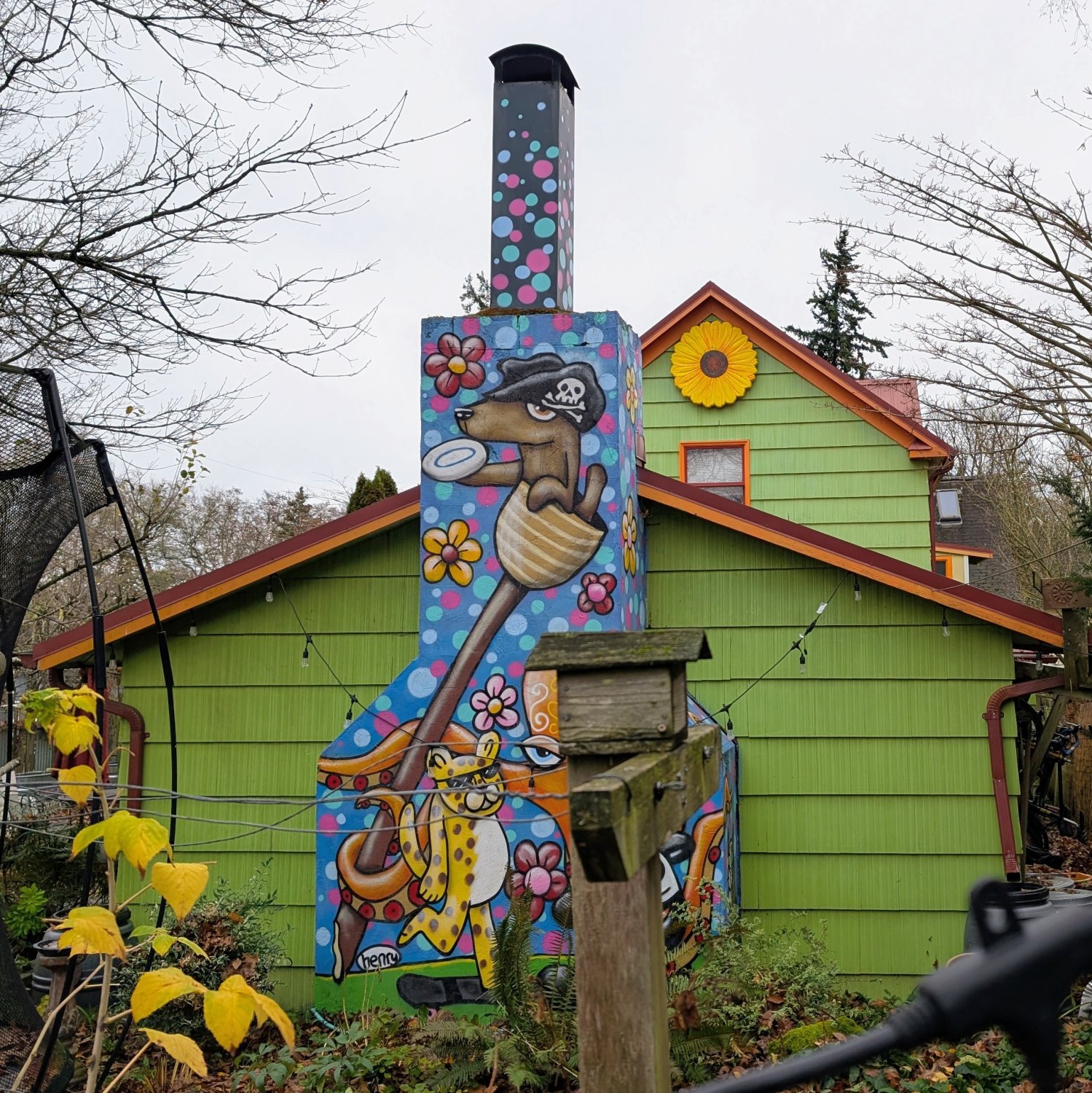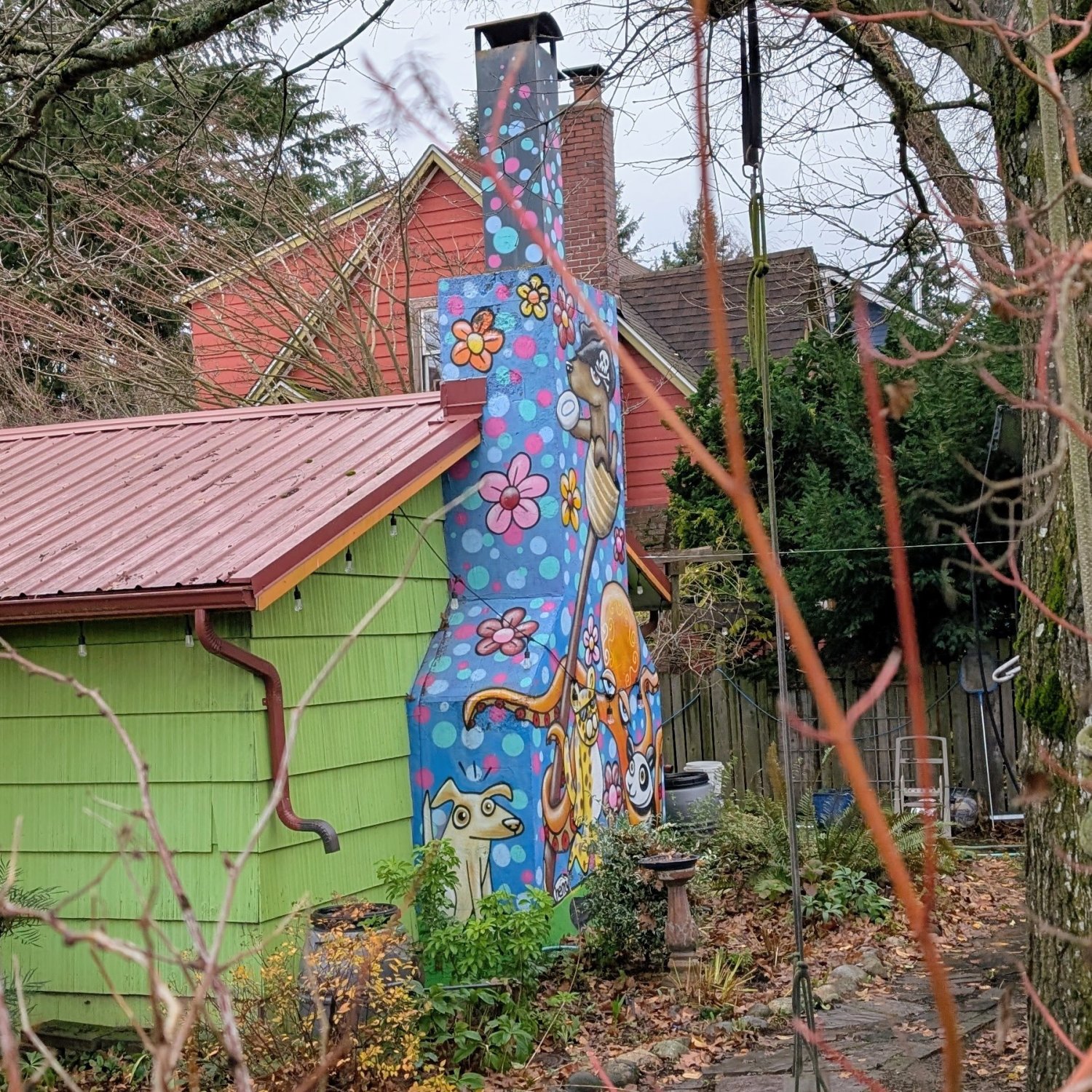 In the daylight today I was able to see the whole chimney is a henry mural! Tough to get a good photo over their fence and around the trampoline.
