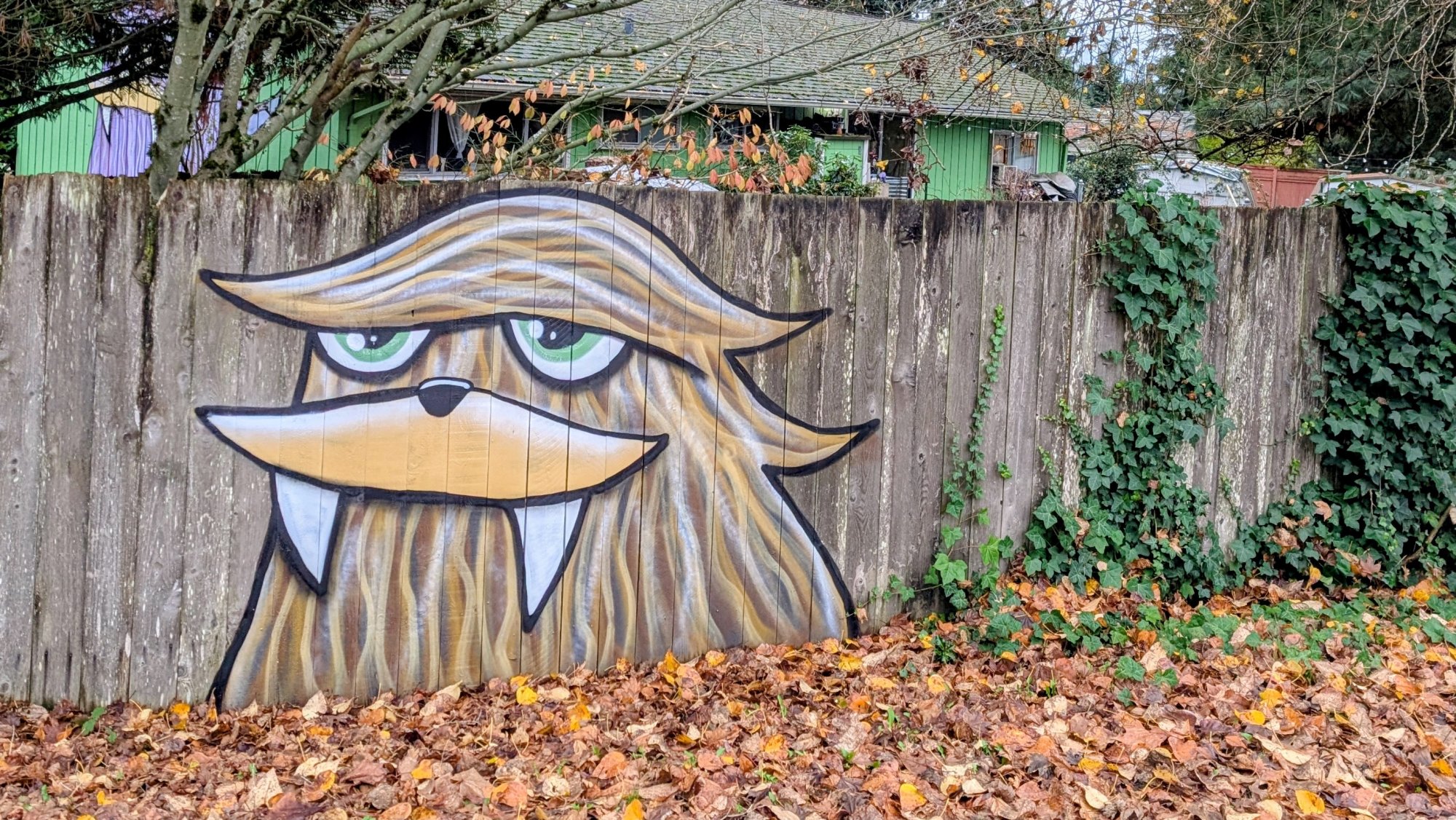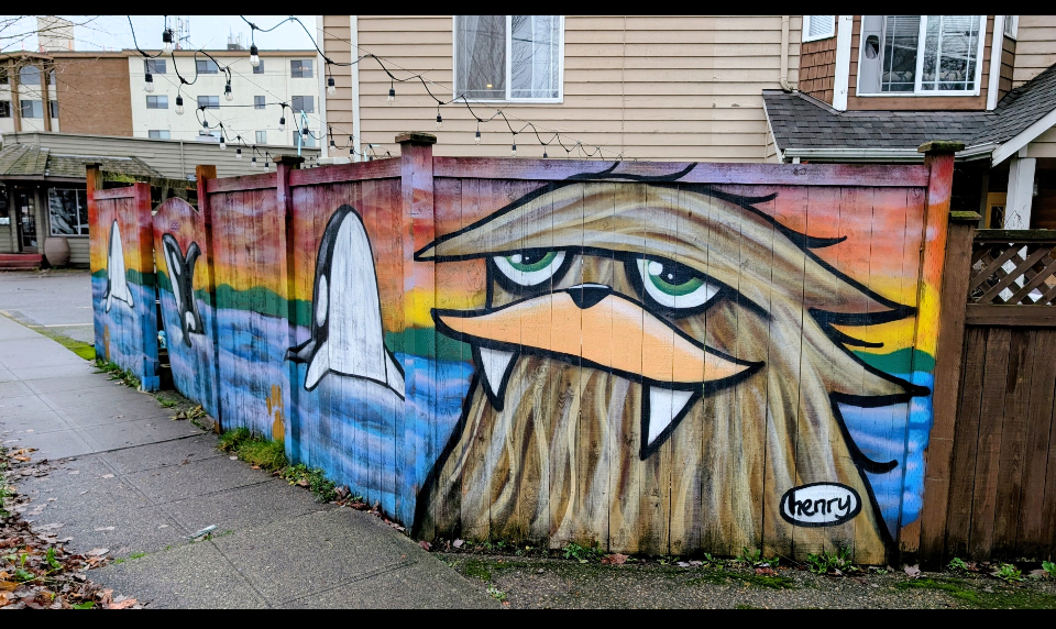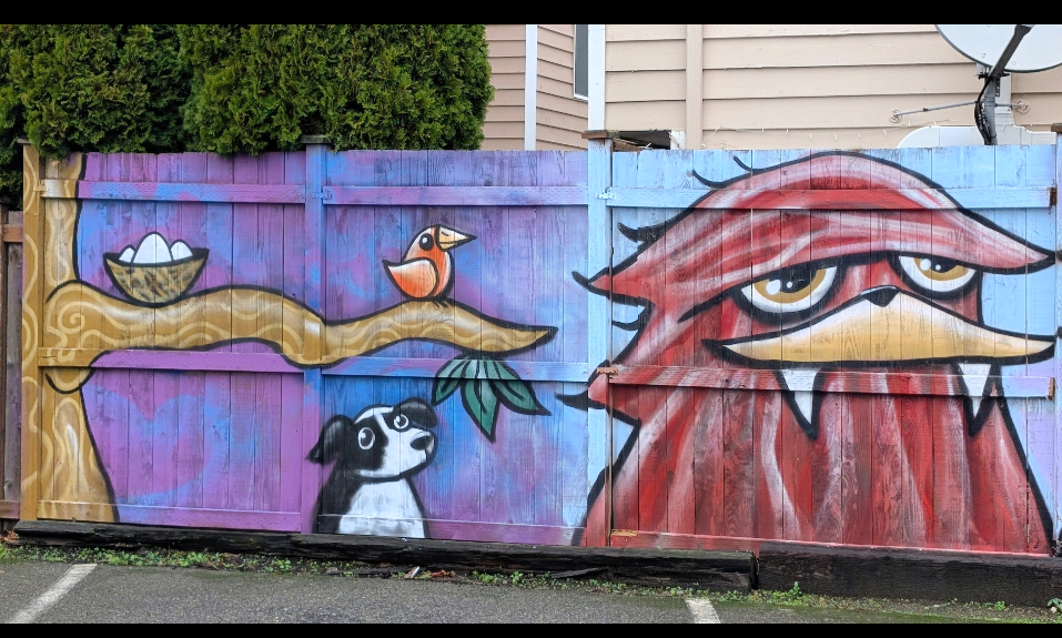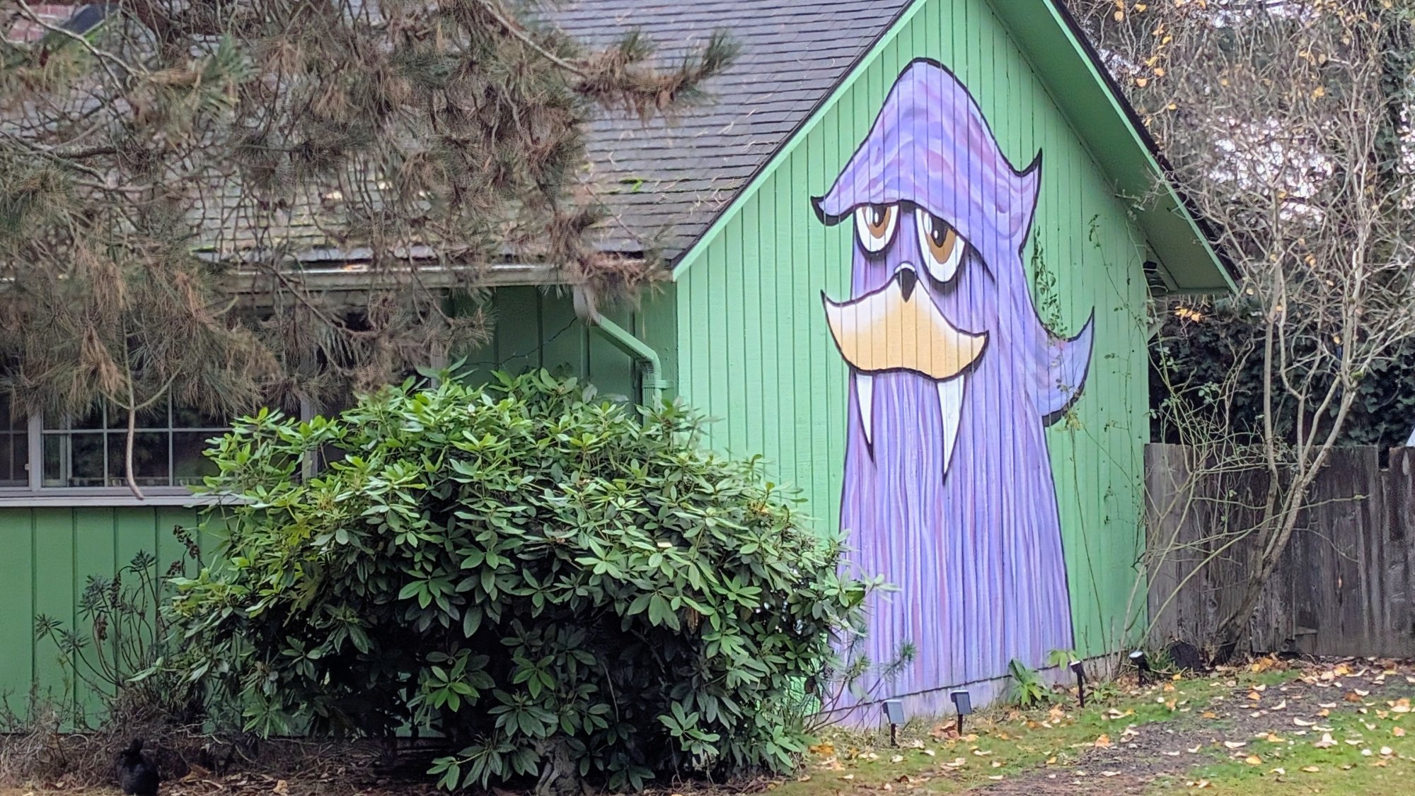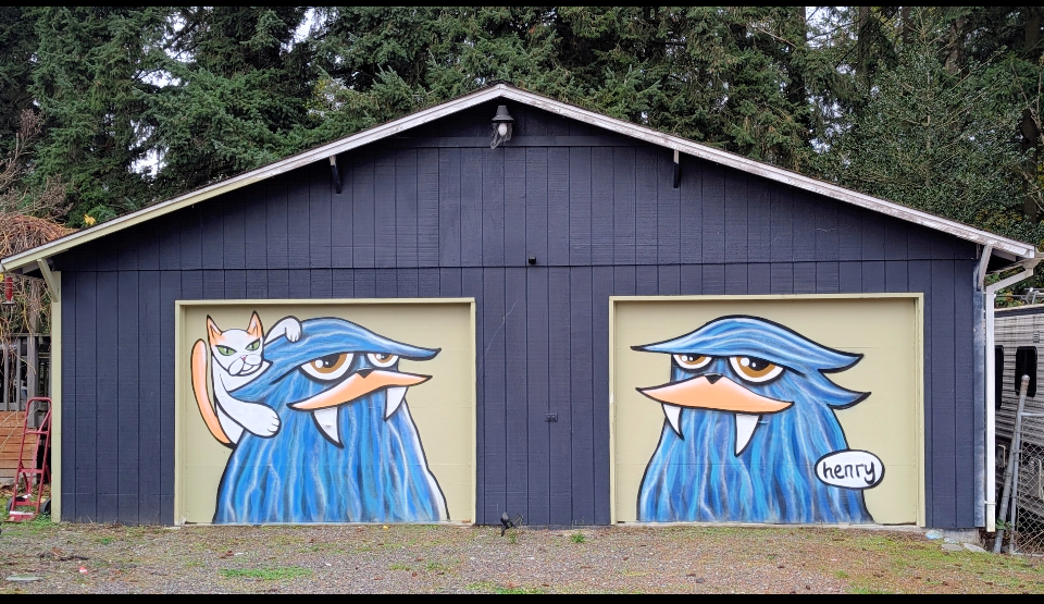 In the daylight today I was able to see the whole chimney is a henry mural! Tough to get a good photo over their fence and around the trampoline.