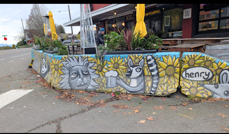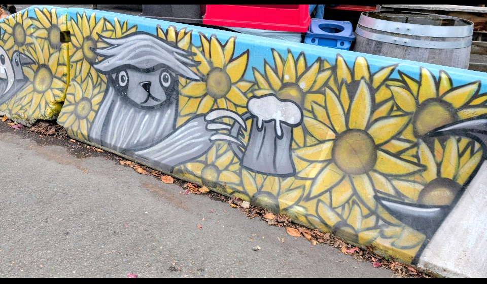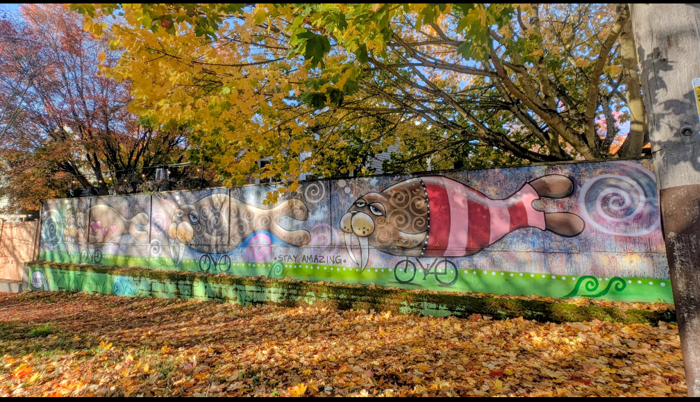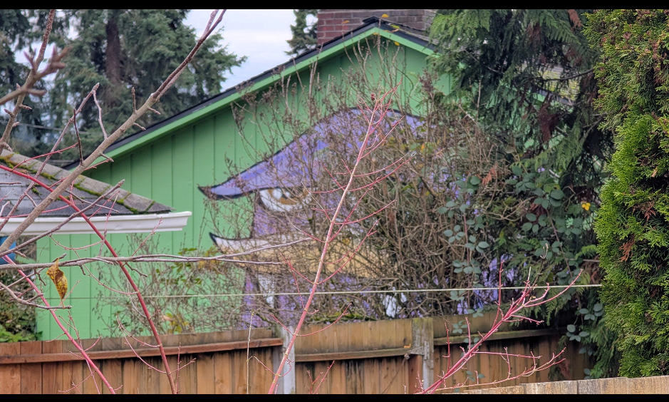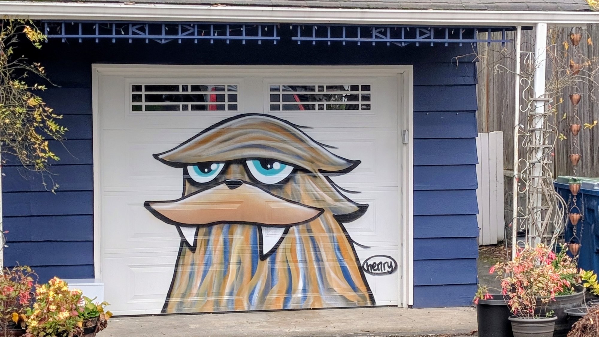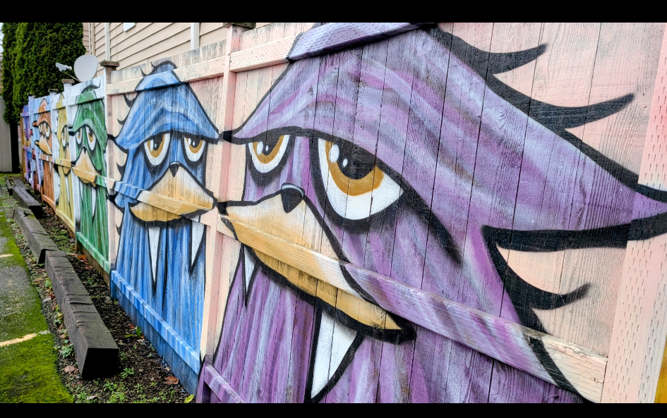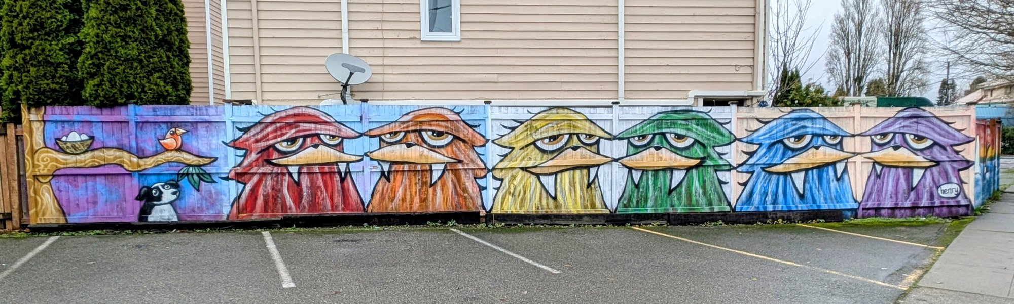 In the daylight today I was able to see the whole chimney is a henry mural! Tough to get a good photo over their fence and around the trampoline.