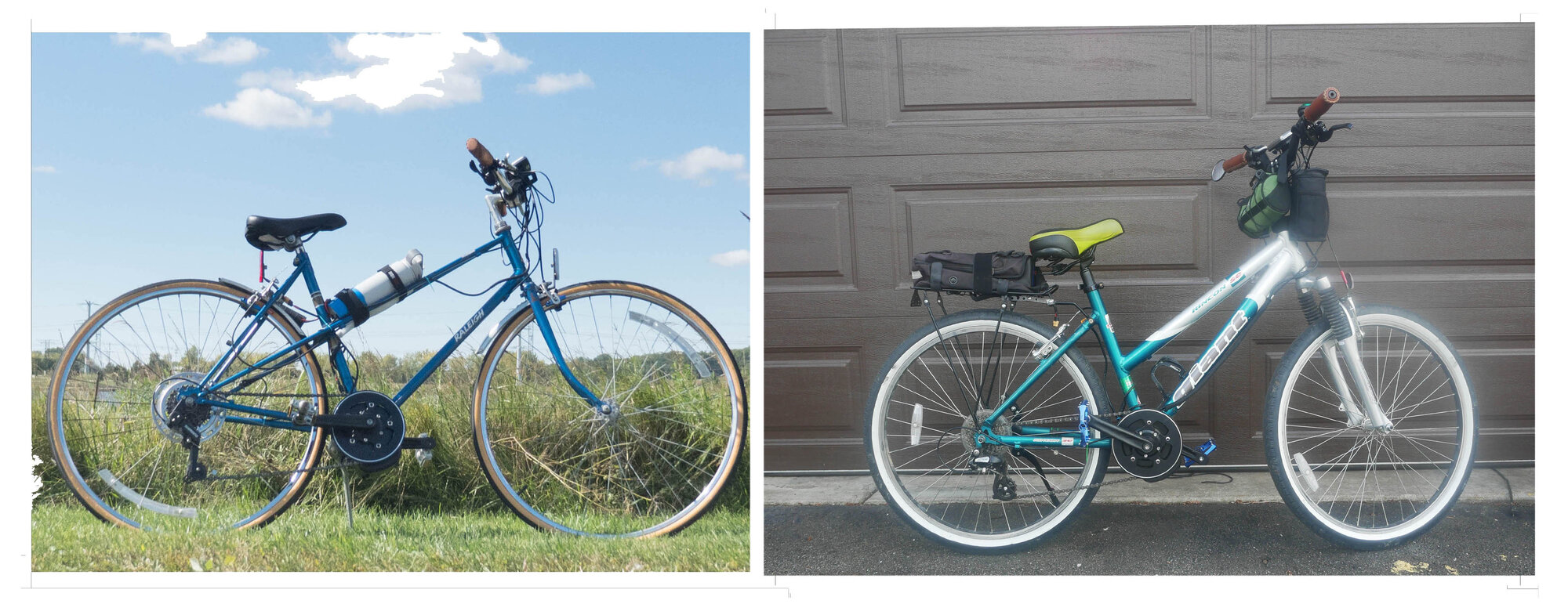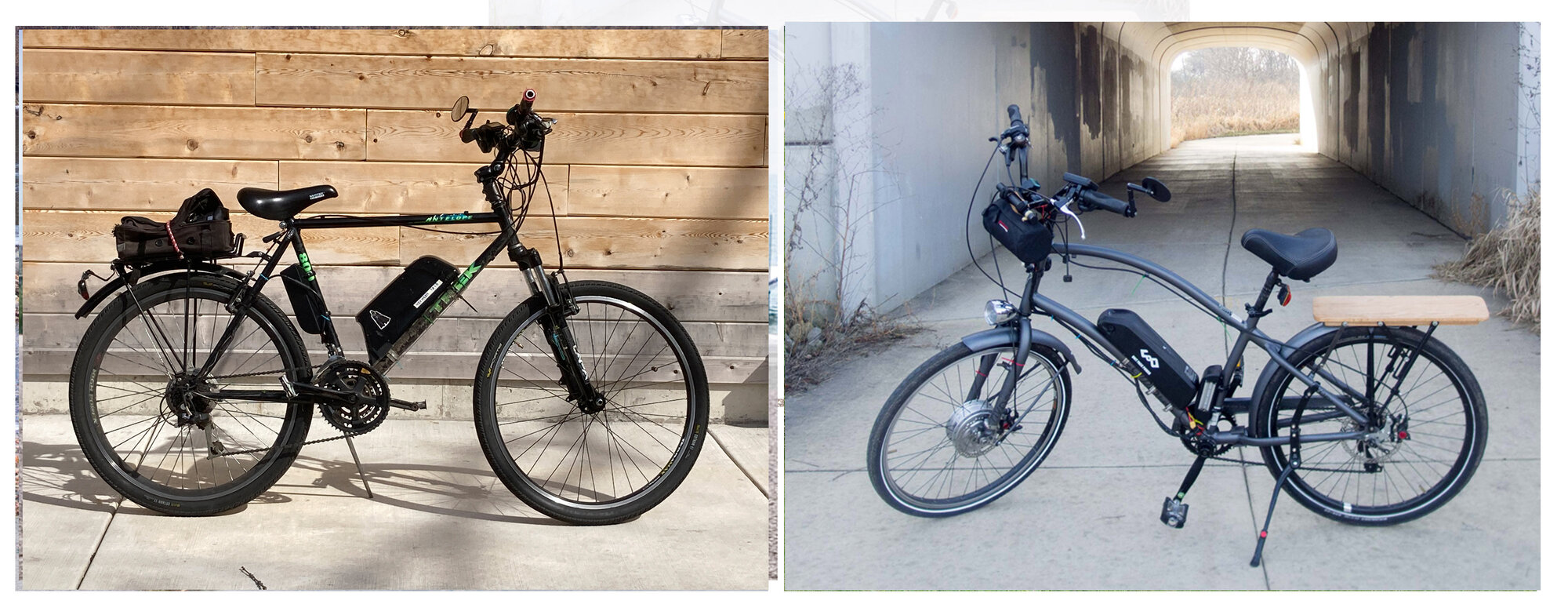 And finally a pair of hub motor beaters. The left side is my first ebike converted in 2016, my kid's old steel Trek 800. Motor kit and battery cost $480 and it was trouble free. It did have a crude e-level pedal assist, but I was used to it. This winter, I picked up some closeout 48 volt batteries. Since the Trek was only a 36V bike, I put in a 48V controller with vastly improved pedal response, Now I find a lot more fun to ride.