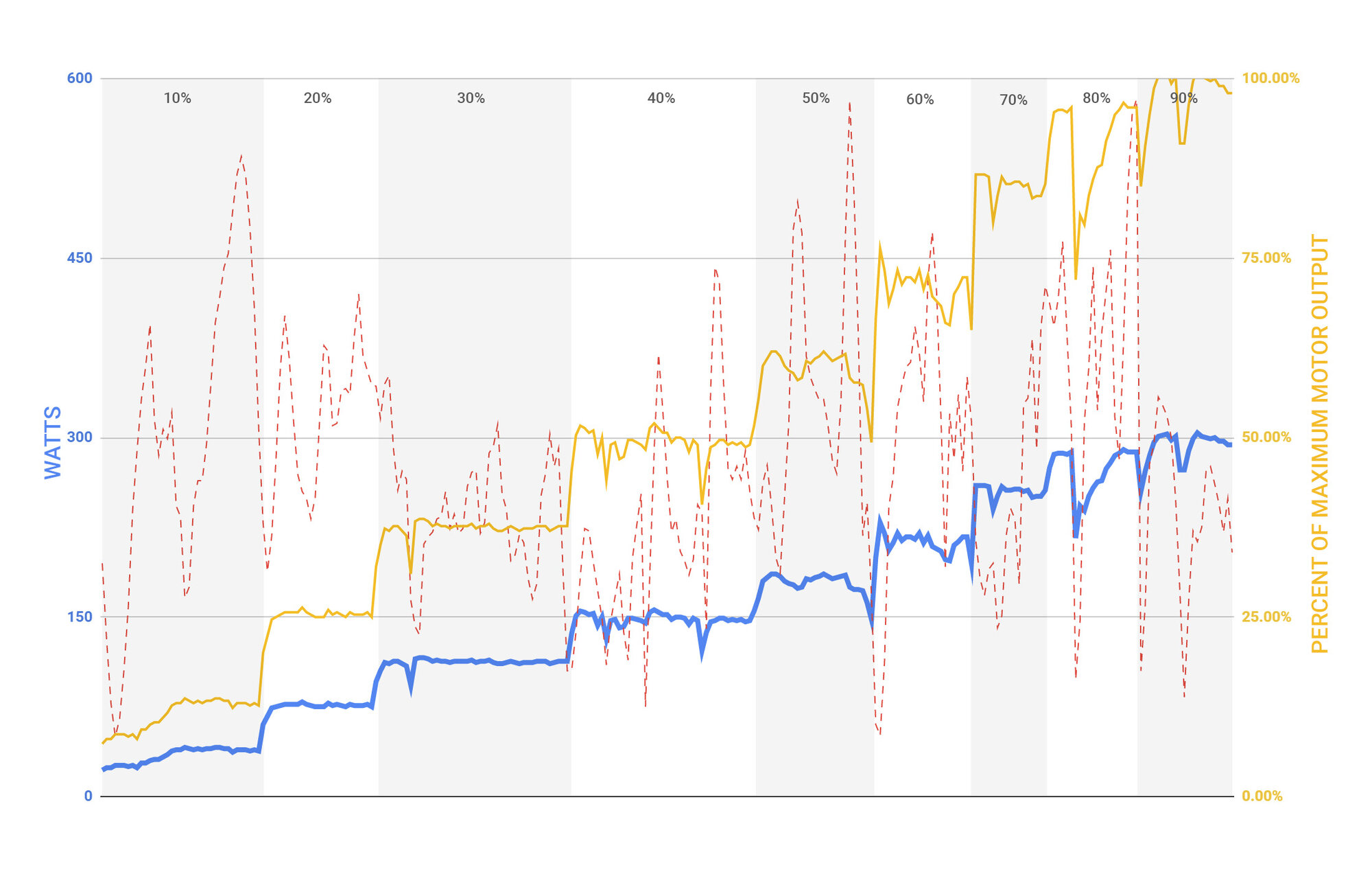 having pretty much found the assist percentage behaving as expected, i did another experiment, the other way around. 100% assist (so it's going to always try and be "2x me" plus the original me) but stepping the max support from 10 to 90 in 10% increments. this behaves exactly as expected, with some spikes in the data and the big caveat that it seems around 10% ahead of itself - at 40% max power, it's actually at 50%, at 90, it's pretty much at 100, etc.